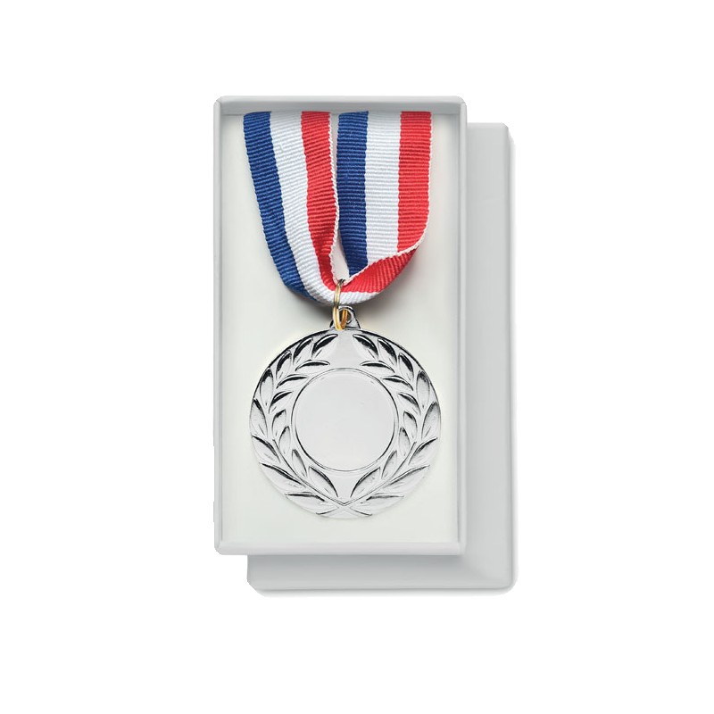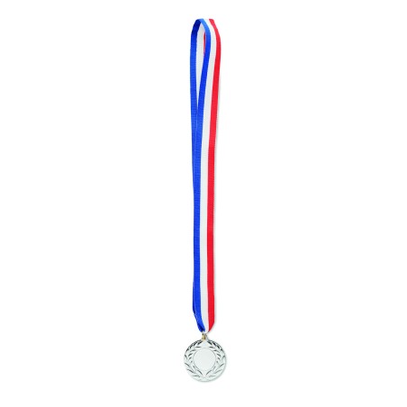 Médaille en fer avec sangle en polyester dans les couleurs bleu, blanc et rouge. Diamètre de 5 cm