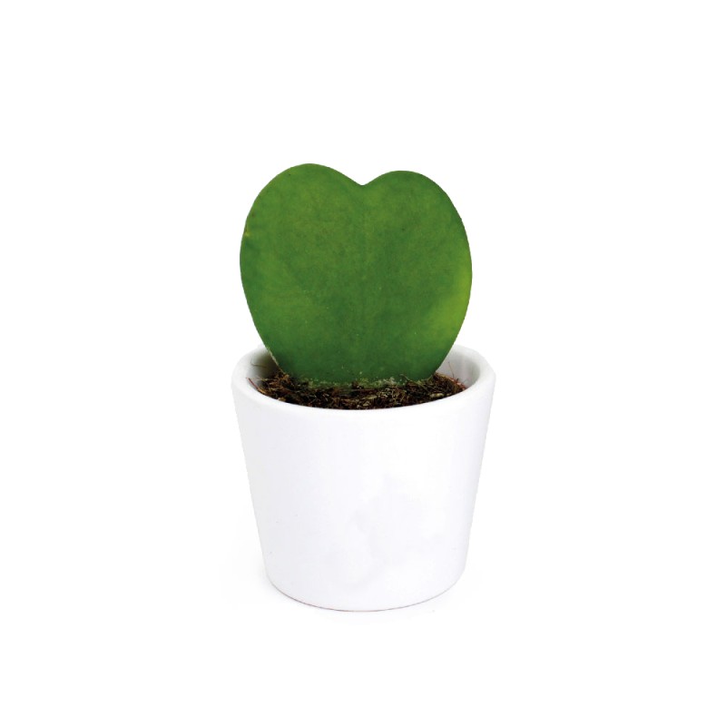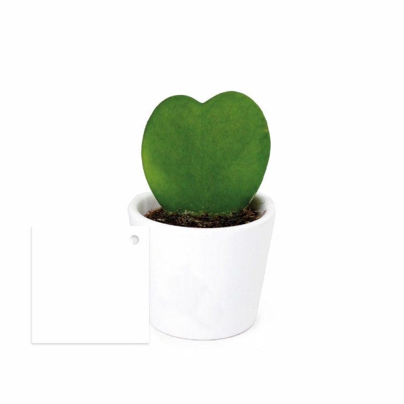Plante Hoya en forme de coeur, placée dans un pot céramique ou terre cuite de Ø70mm x H60mm emballé par du papier fleuriste ou papier kraft. Du raphia décoré d'une étiquette en papier 350g/m² de 50x50mm maintient le tout.