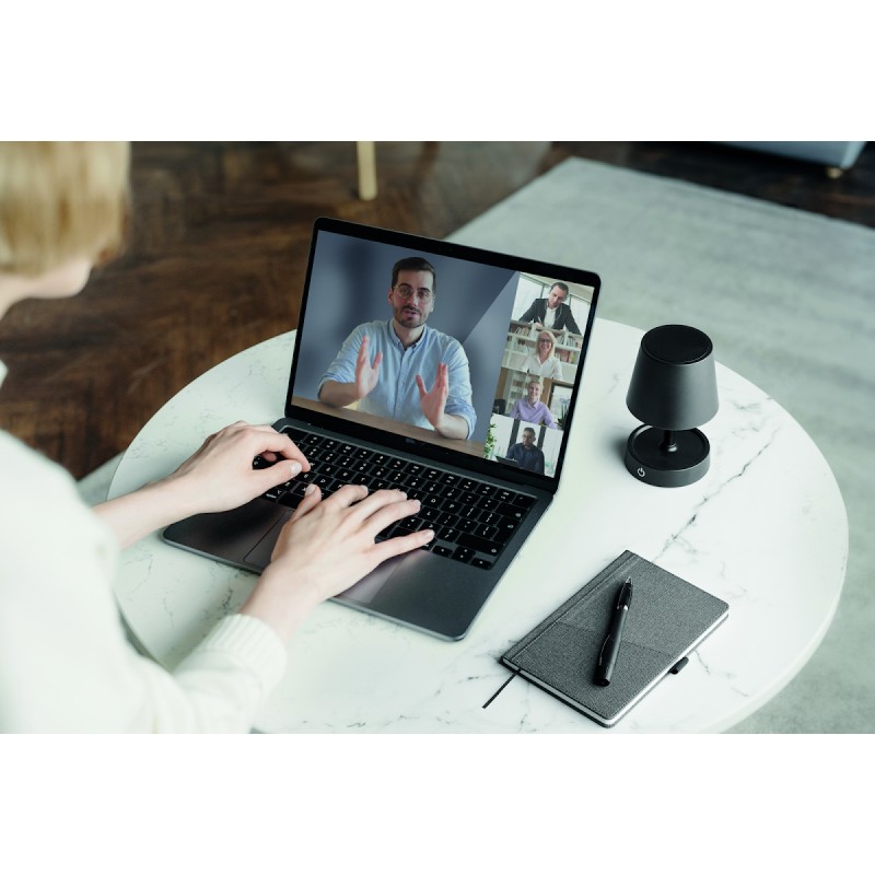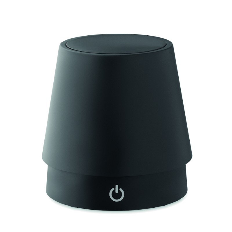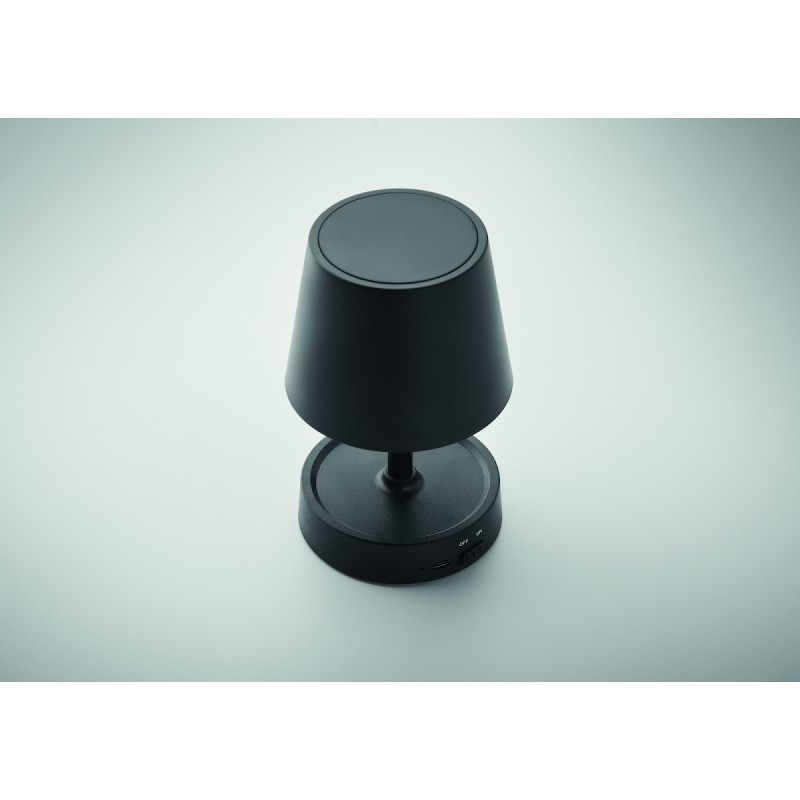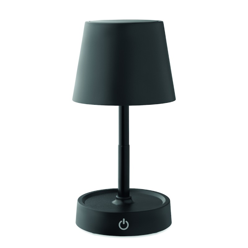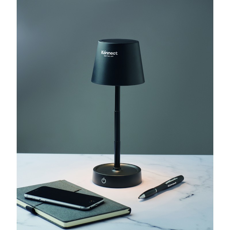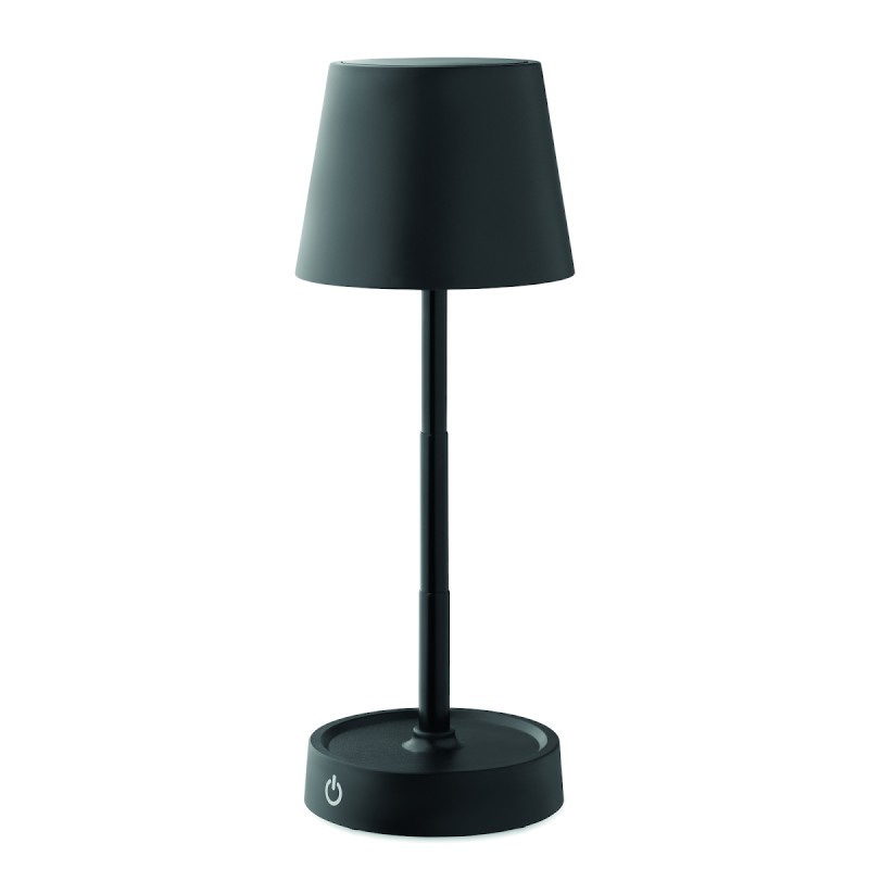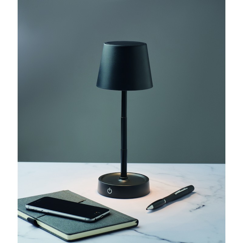 Lampe de table USB rétractable et rechargeable en ABS. Comprend 12 lampes LED avec intensité lumineuse réglable et gradation progressive. Batterie intégrée : 1200 mAh (6h d'autonomie après charge complète). Câble de charge USB Type-A vers Type-C inclus.
