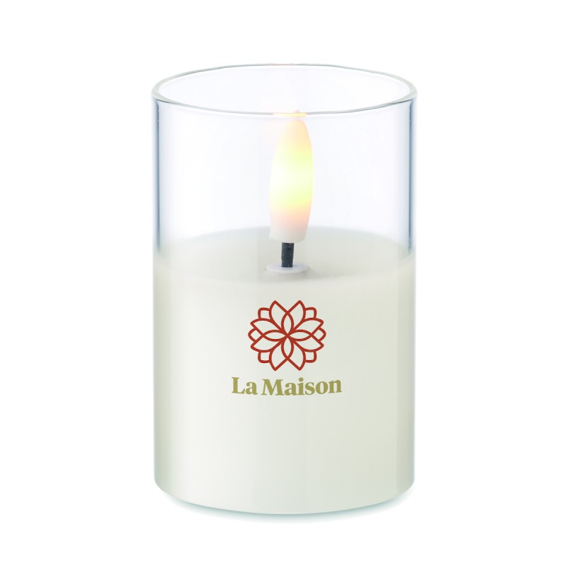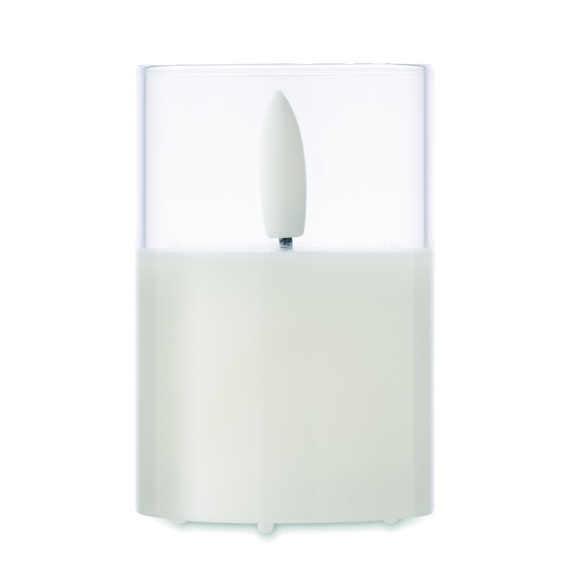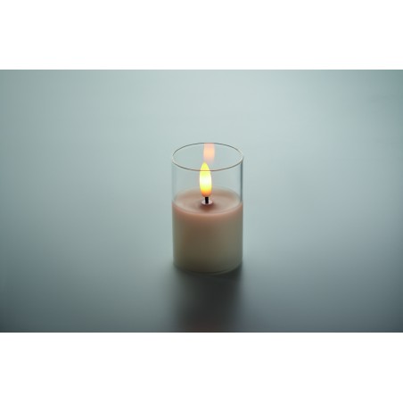 Petite bougie de cire LED à effet de flamme réelle dans un support en verre. Pile CR2032 incluse.