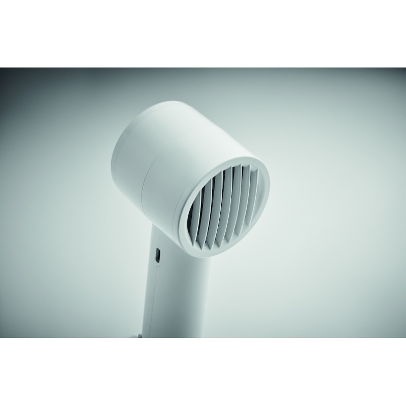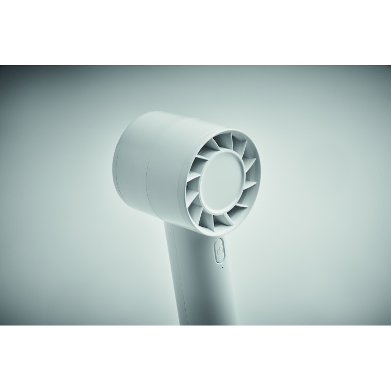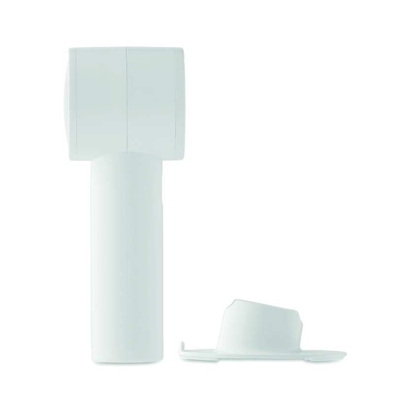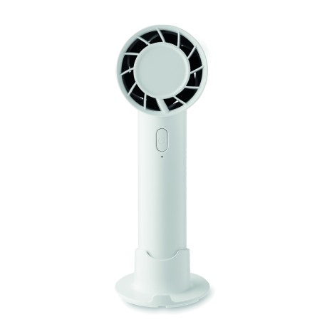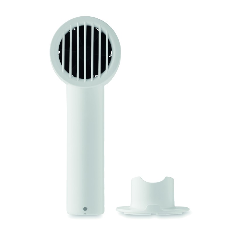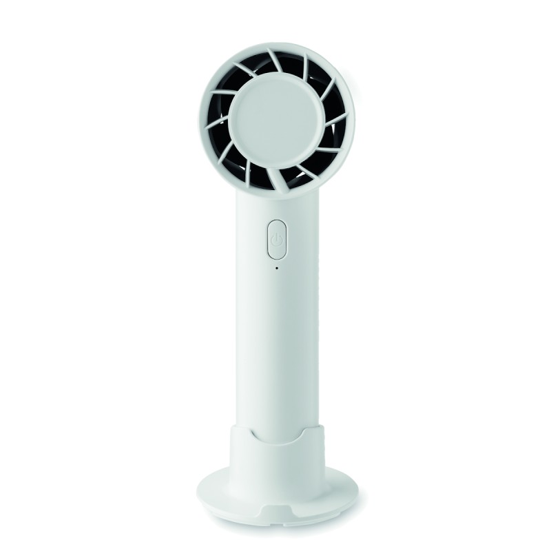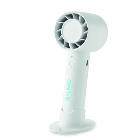 Petit ventilateur portable avec support de bureau et fonction support de téléphone. 3 réglages de vitesse. Batterie rechargeable par port USB 2000 mAh.