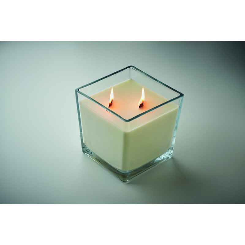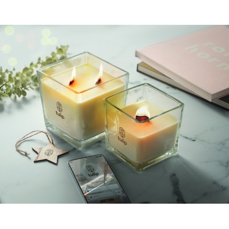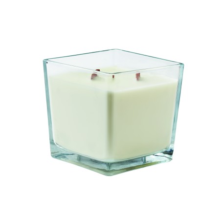 Très grande bougie en cire végétale parfumée à la vanille 1300gr dans un pot en verre avec 2 mèches en bois. Durée de combustion 70 heures