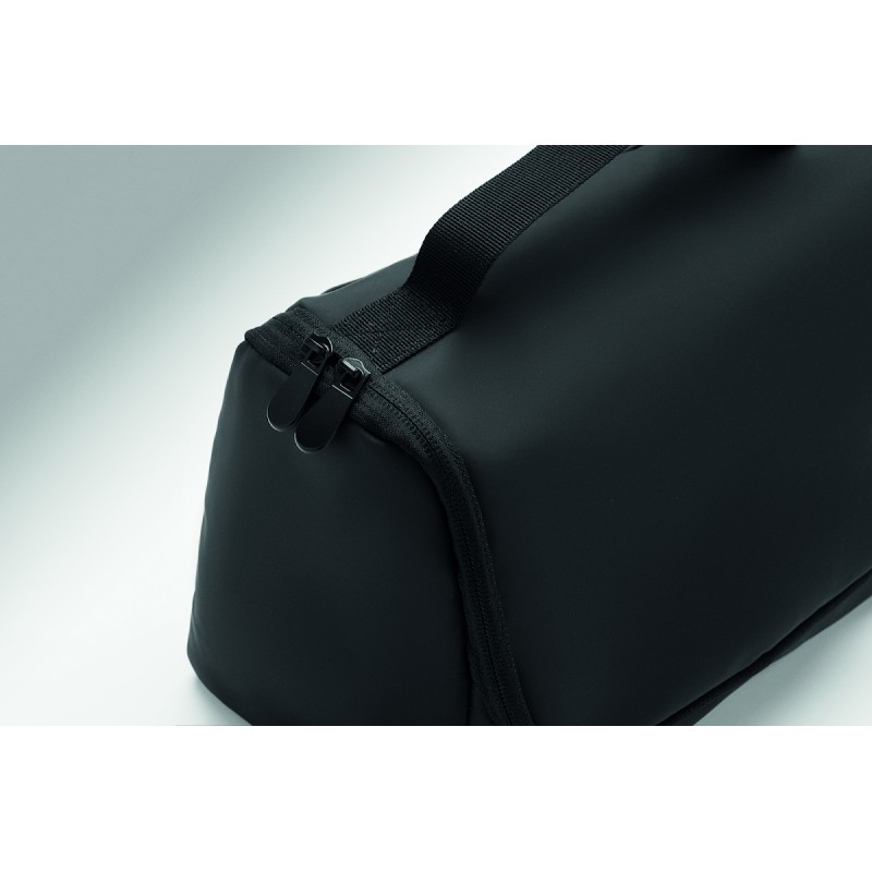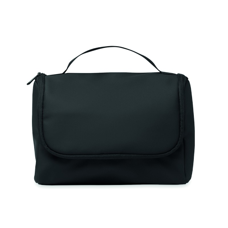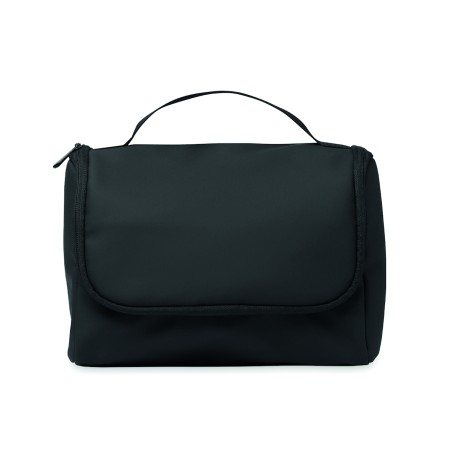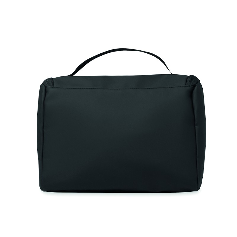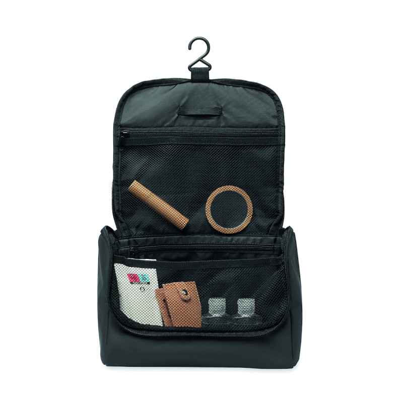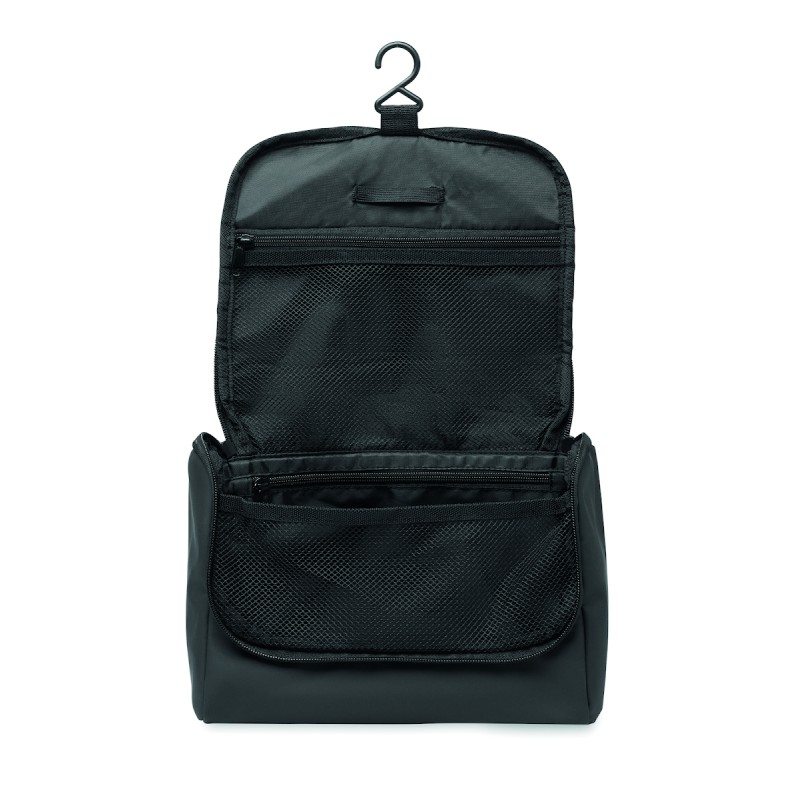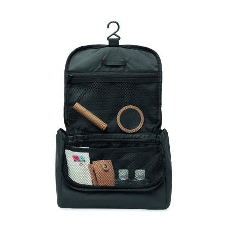 Sac à cosmétique en PU souple avec crochet de suspension et doublure en RPET 210D. Un grand compartiment principal avec un compartiment intérieur en filet zippé et un compartiment en filet.