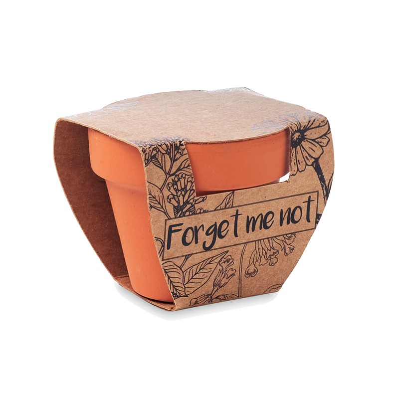 Petit pot en terre cuite contenant des graines de myosotis ''forget me not''. Fabriqué en UE. Tablette de terreau incluse.