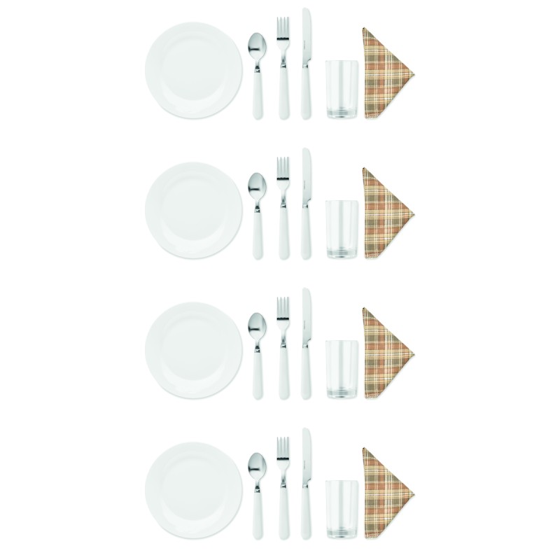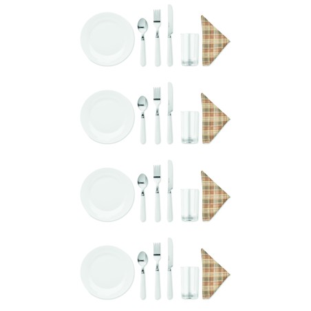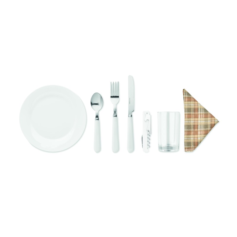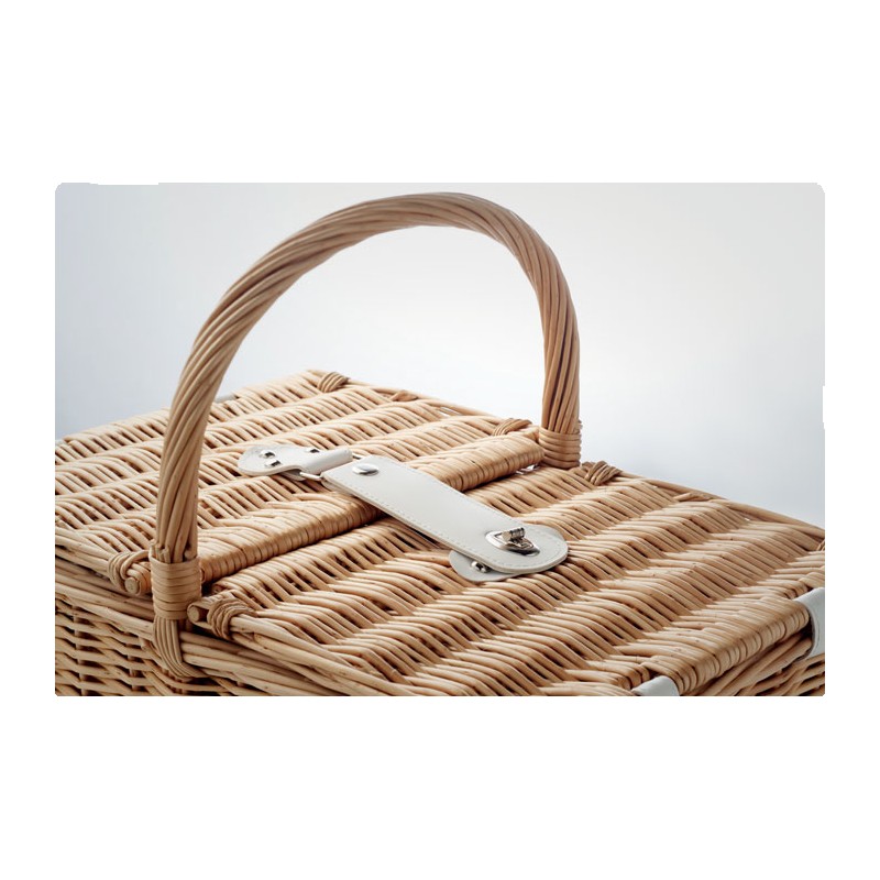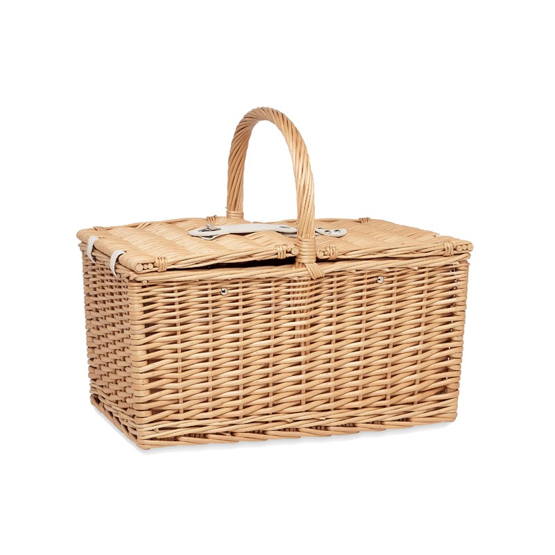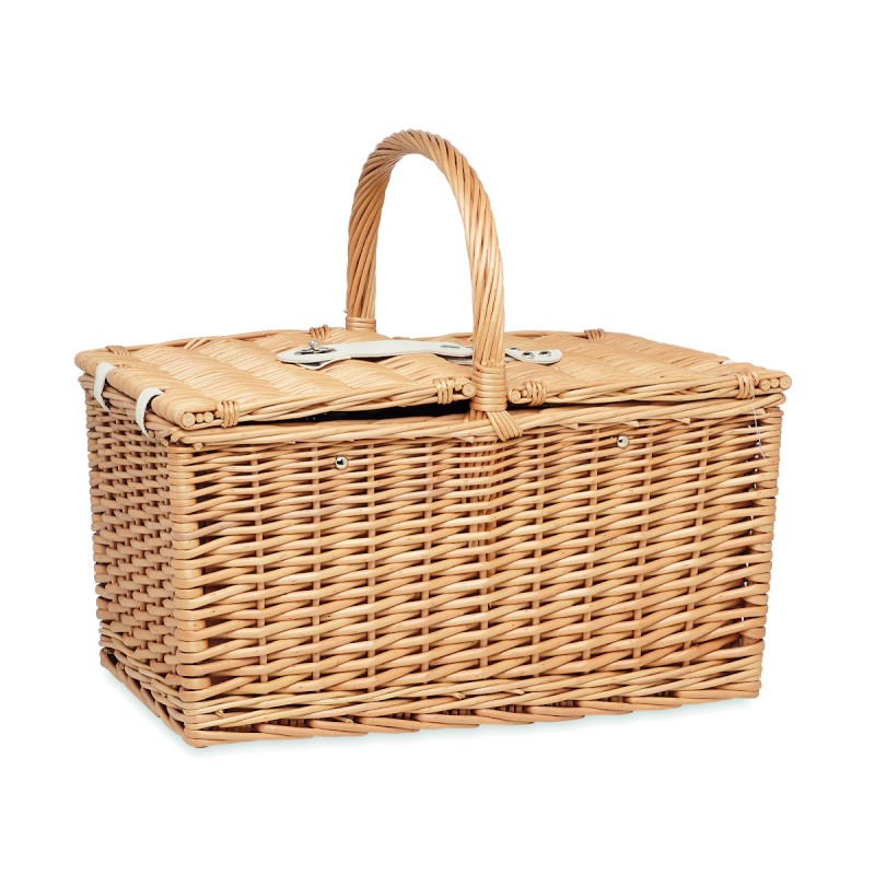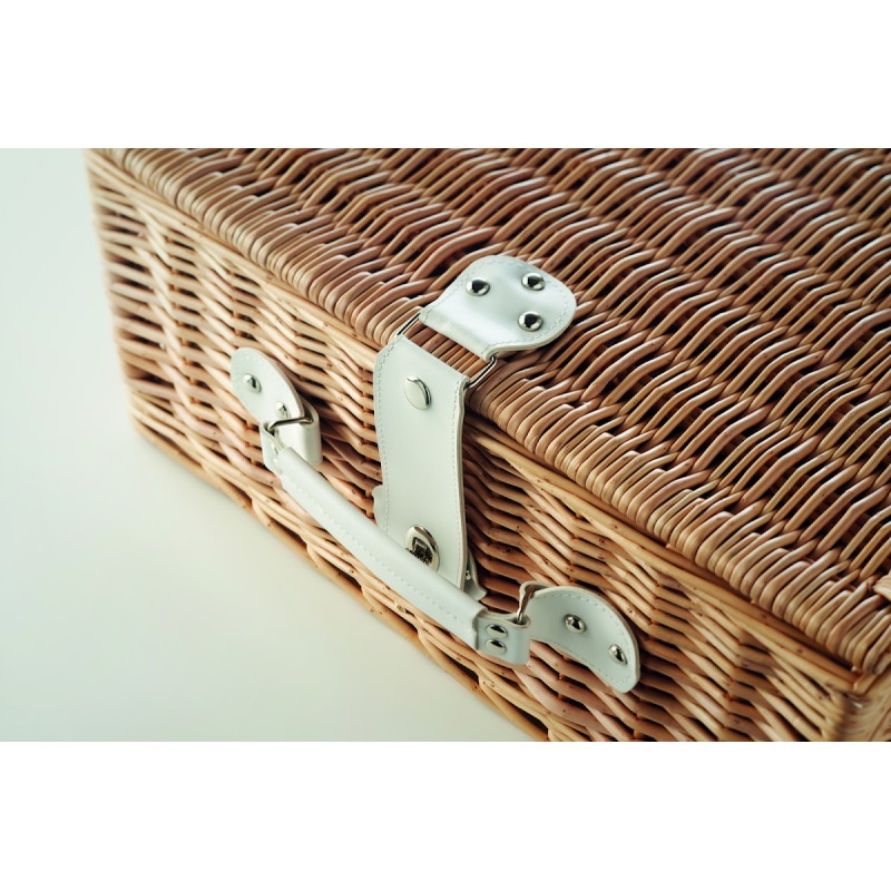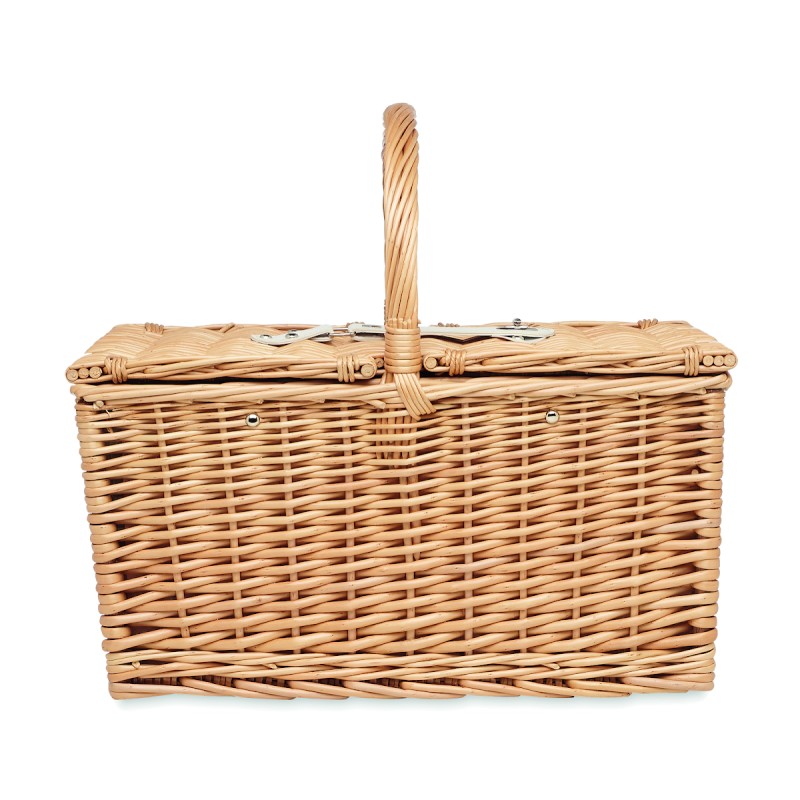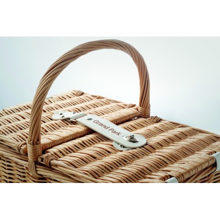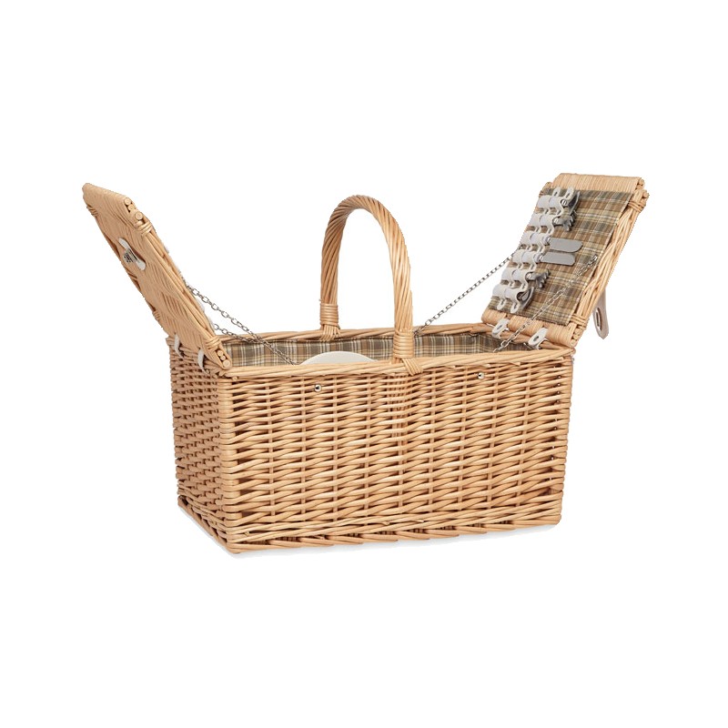Panier à pique-nique en osier pour 4 personnes, comprenant 4 cuillères, 4 fourchettes et 4 couteaux en acier inoxydable, 4 assiettes en céramique, 4 verres en verre et 4 serviettes en poly coton et 1 limonadier.