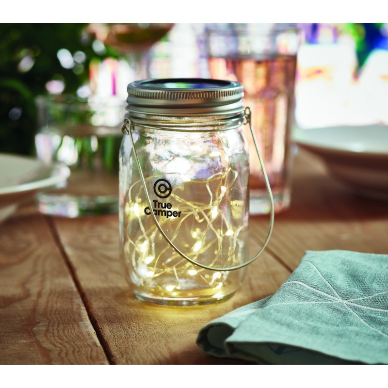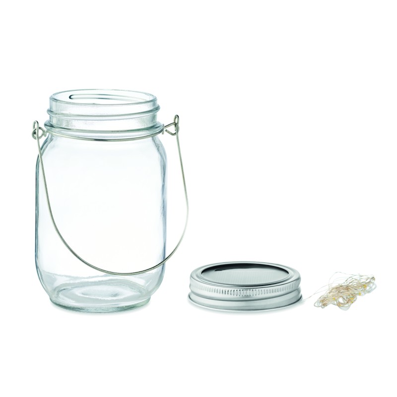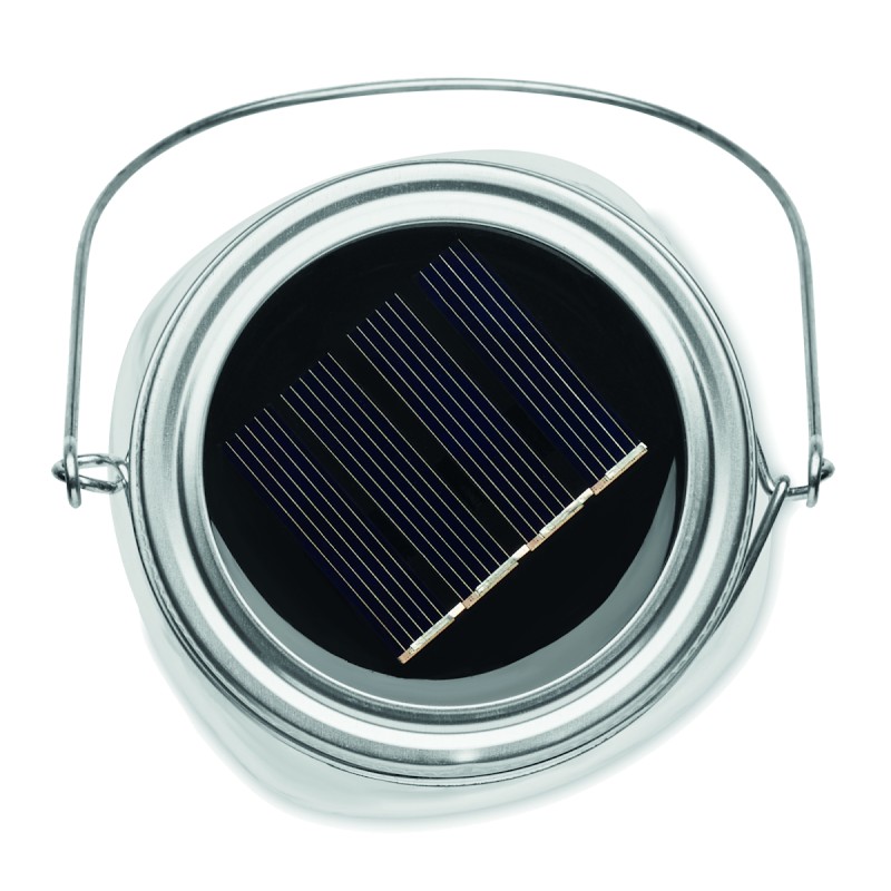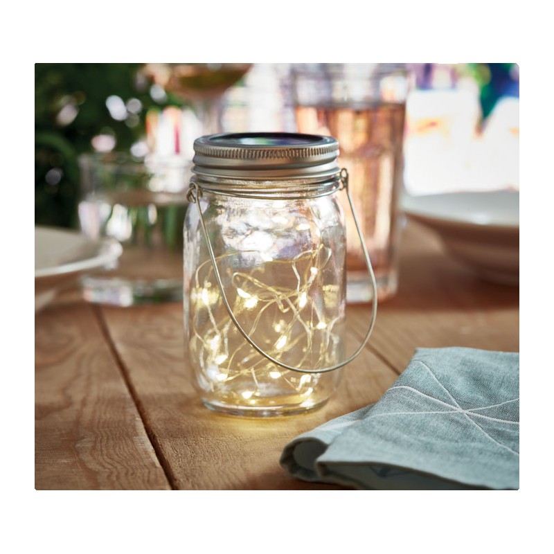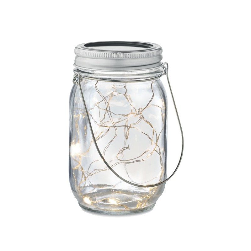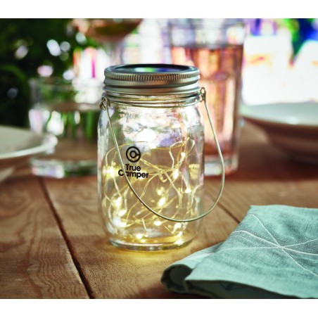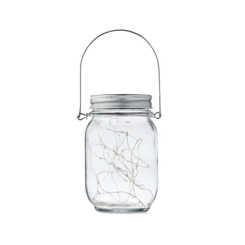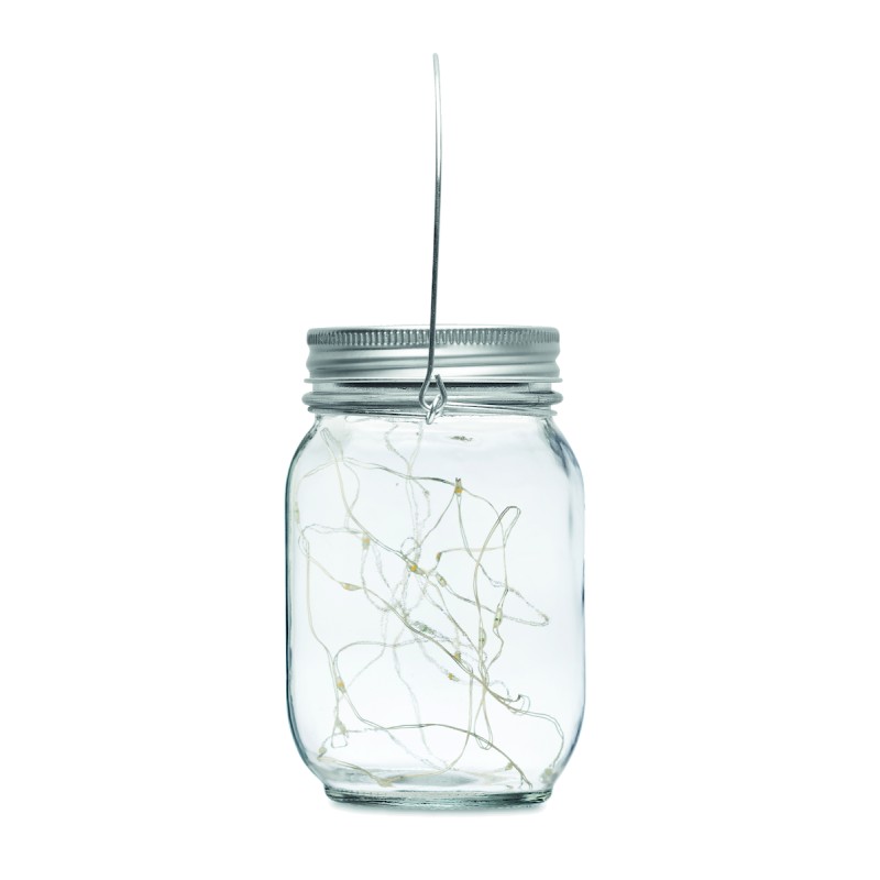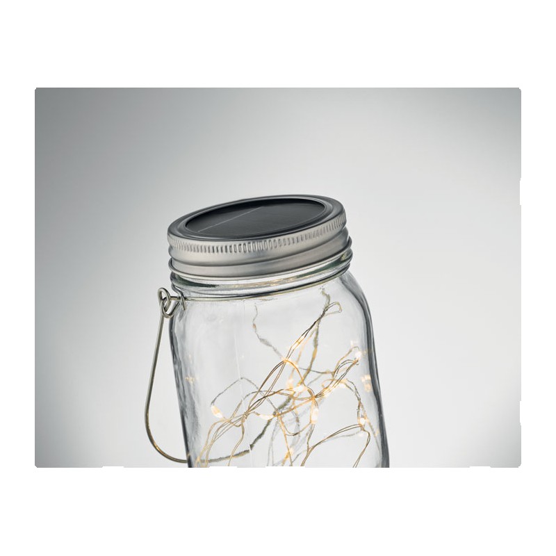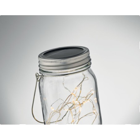 Lampe solaire d'extérieur en forme de pot avec guirlande lumineuse à 20 LED. Suspension sur le dessus. Durée de fonctionnement d'environ 5 heures. Batterie 300 mAh NI-MH incluse. IP44.
