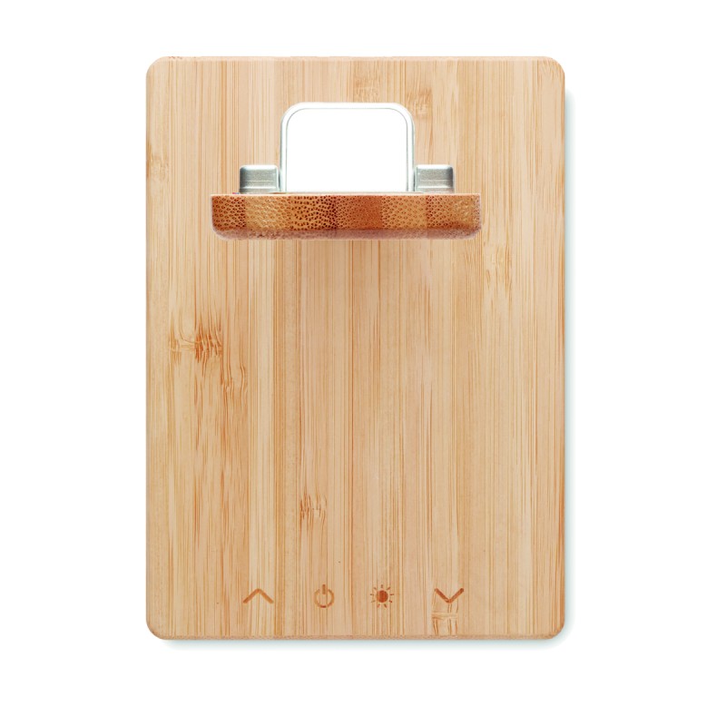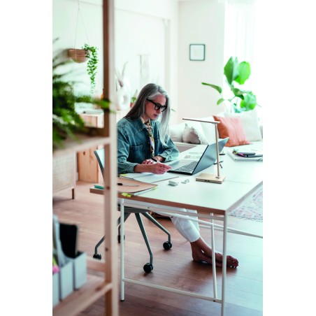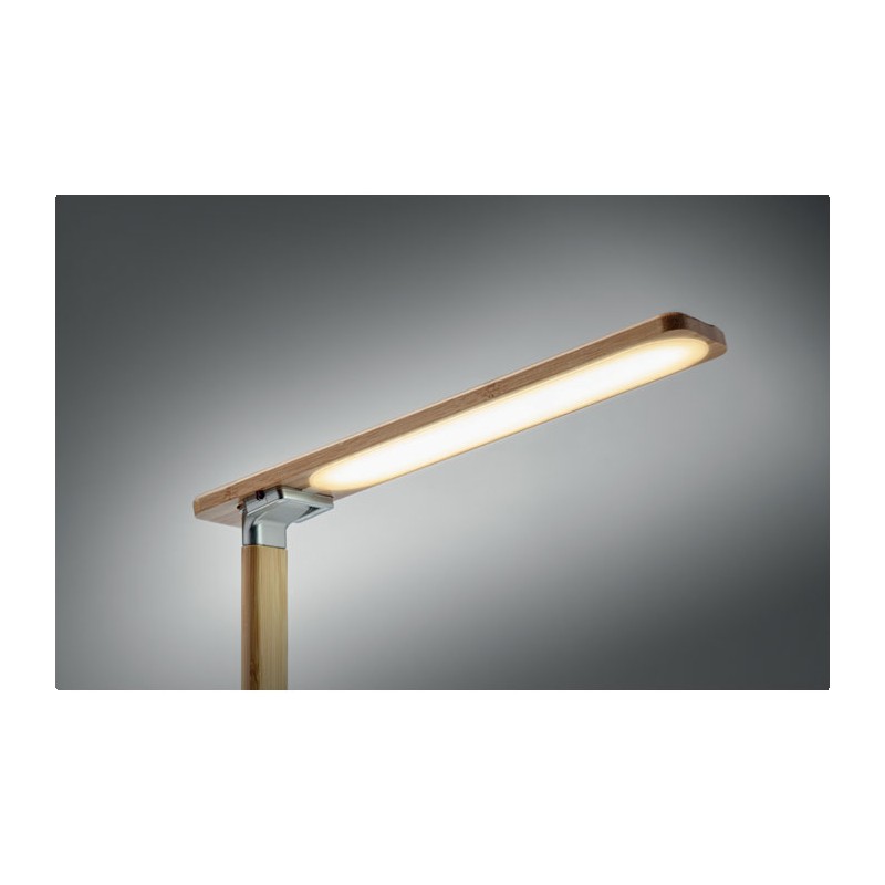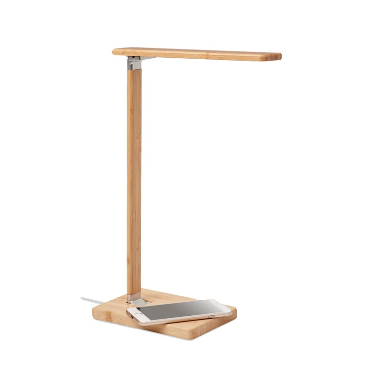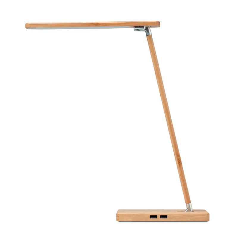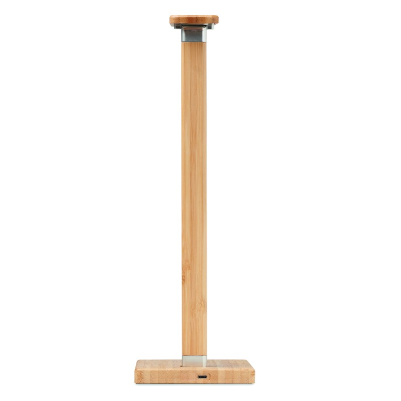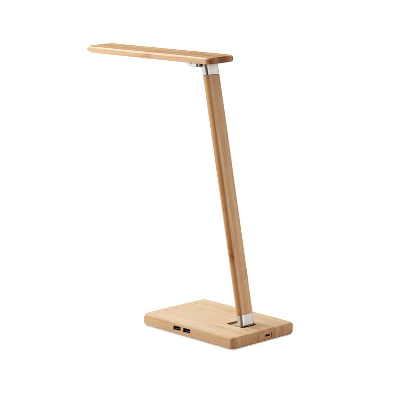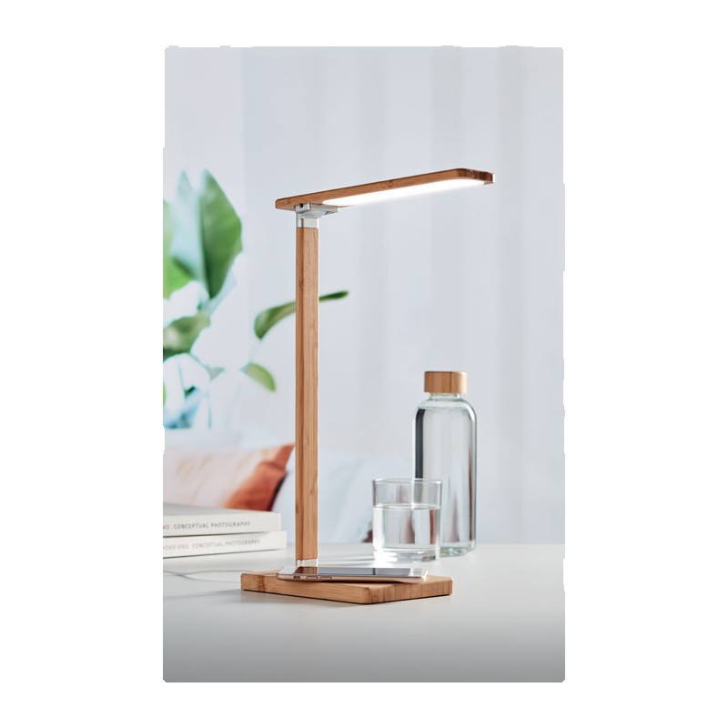 Lampe de bureau pliable en bambou avec 48 lampes LED, charge sans fil rapide 10W et 2 ports USB. Écran tactile. Sortie : DC 9V/1.1A Le bambou est un produit naturel, et présente de légères variations de couleur, de décoration et de tailles. FSC 100% | N5.7 | FSC-C213206