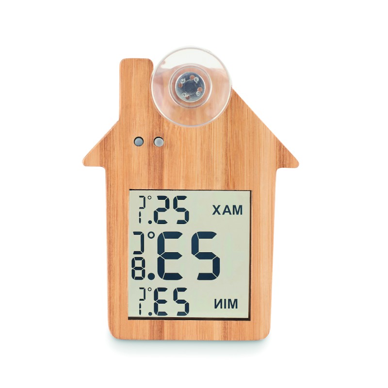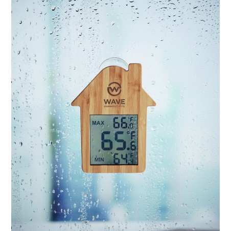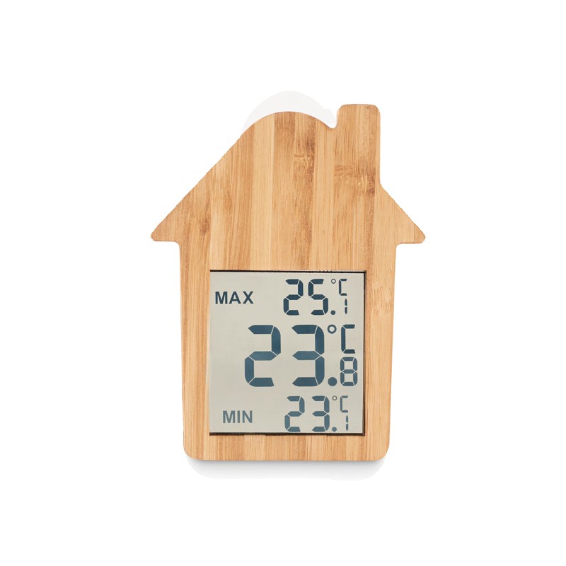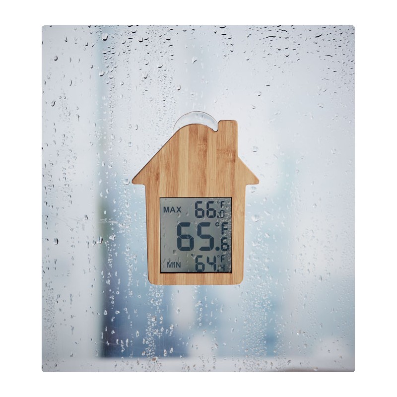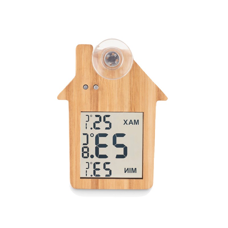 Station météo en bambou en forme de maison avec ventouse à l'arrière. 1 pile LR44 incluse. Le bambou est un produit naturel, et présente de légères variations de couleur, de décoration et de tailles.
