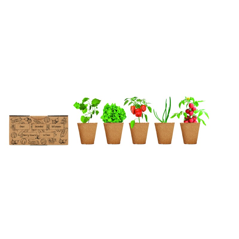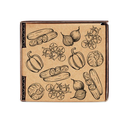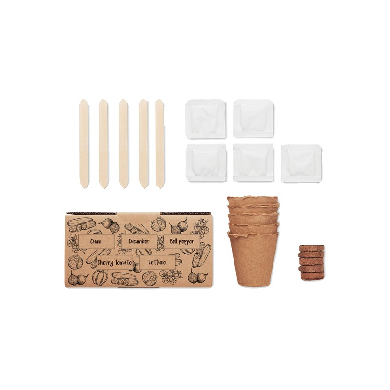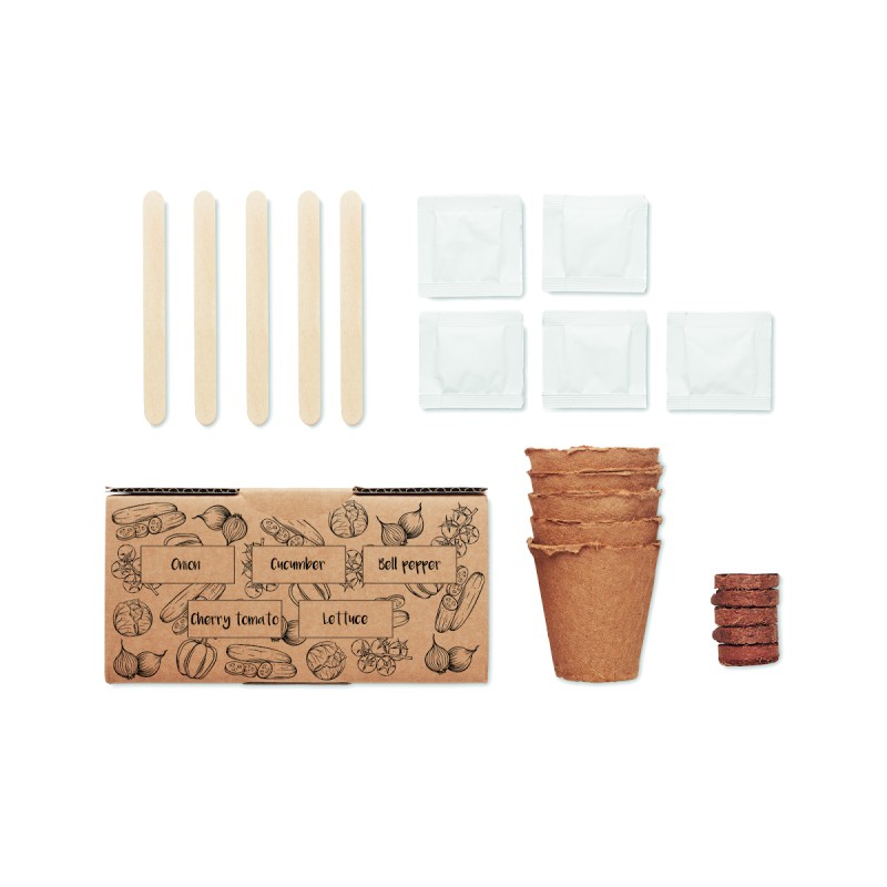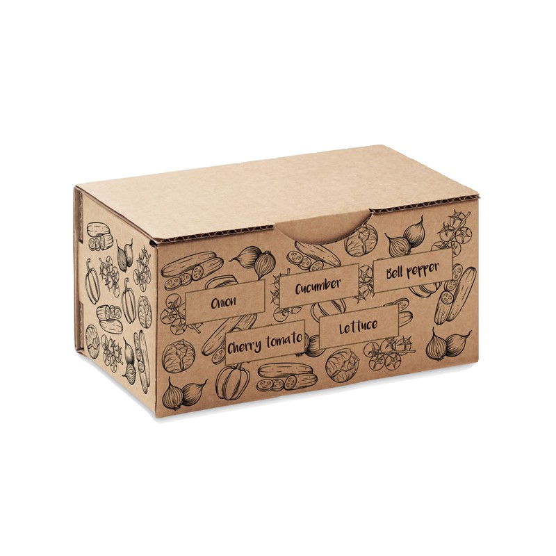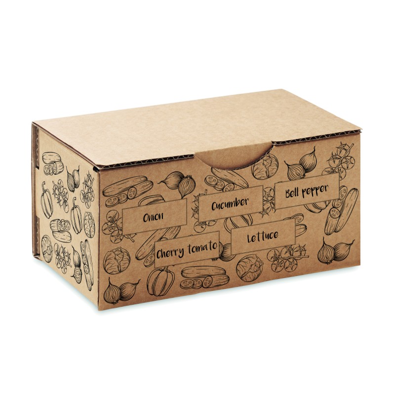 Kit de culture de salade. Boîte contenant des graines d'oignon, de concombre, de poivron, de tomate cerise et de laitue. Fabriqué dans l'UE. Tablette de terreau incluse.