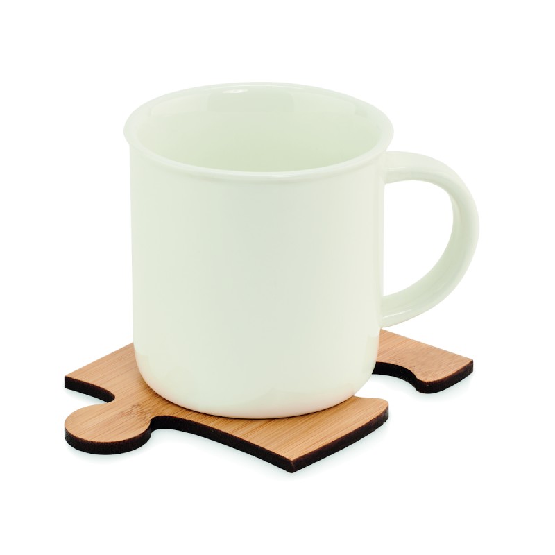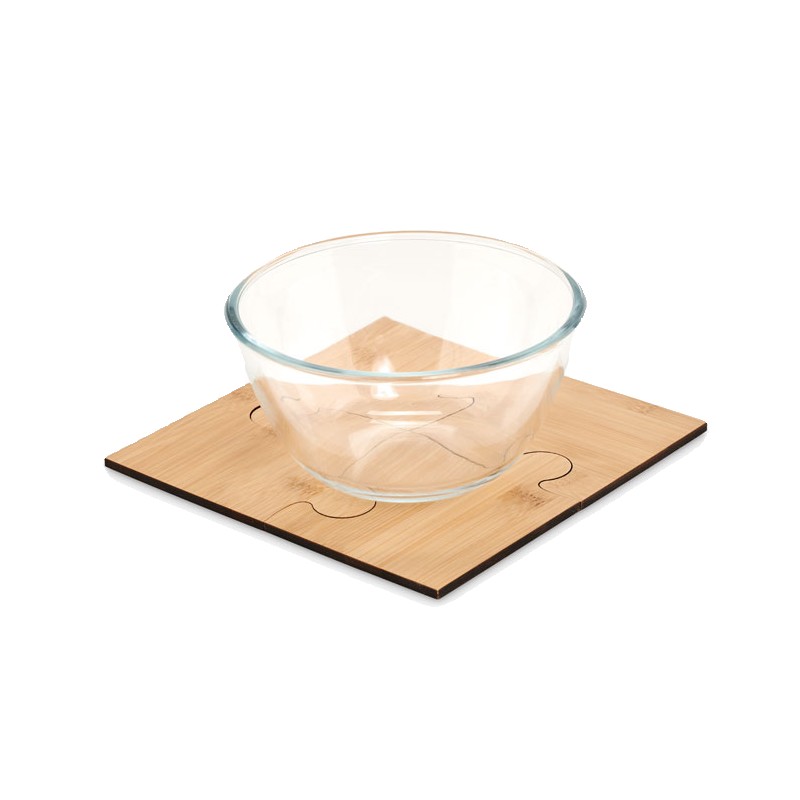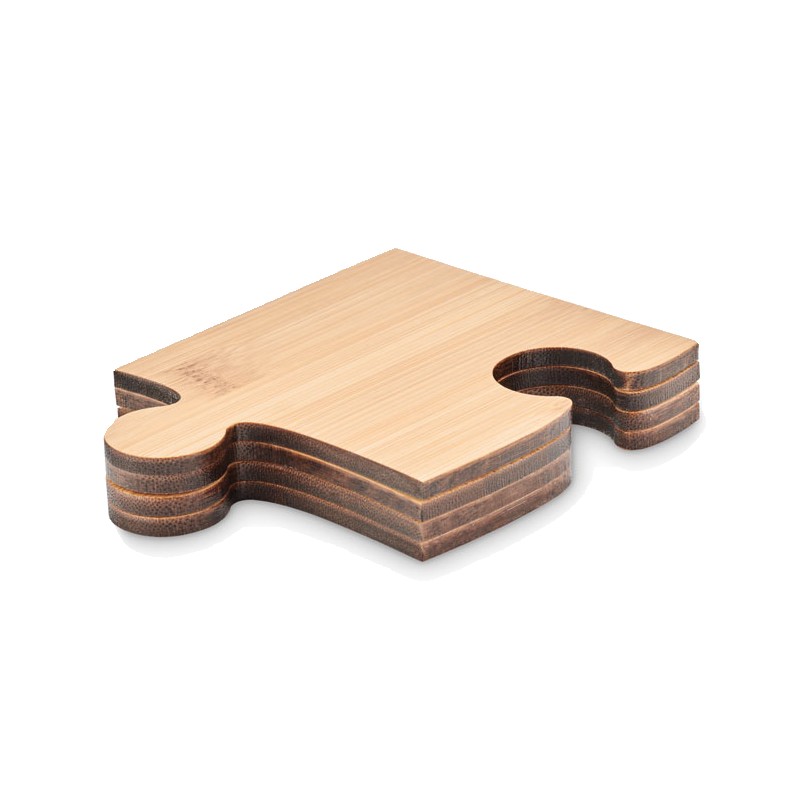 Jeu de 4 sous-verres en bambou en forme de puzzle. Peuvent être utilisés séparément ou assemblés pour former un dessous de plat. Le bambou est un produit naturel, et présente de légères variations de couleur, de décoration et de tailles.