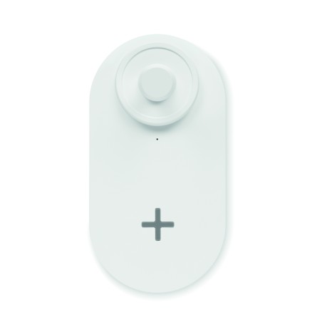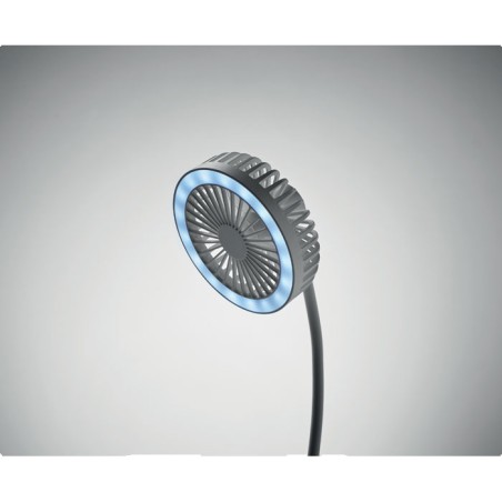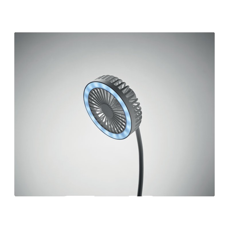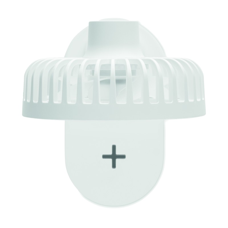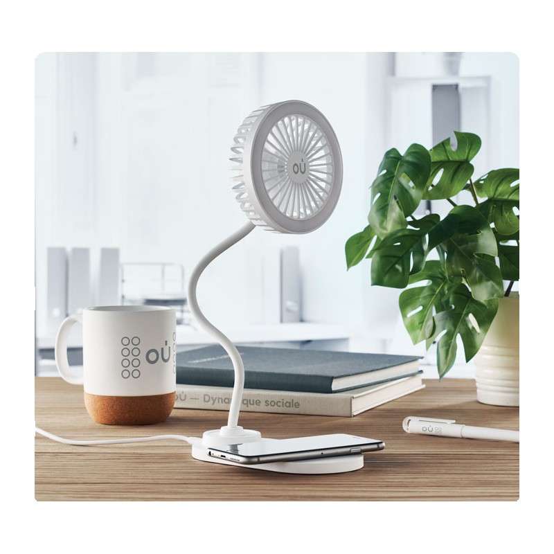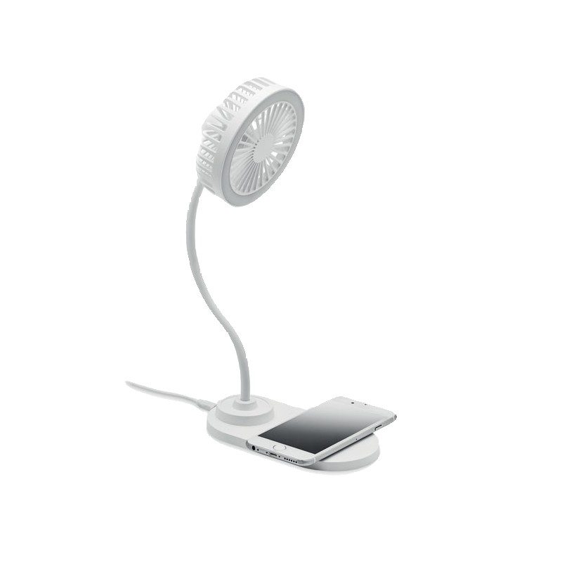 Ventilateur de bureau en ABS avec 3 vitesse avec lumière LED (80 lumens) et chargeur sans fil 10W. Sortie : DC 9V/1.1A (10W) charge rapide. Compatible derniers Androïdes, iPhone® 8 et plus récents.