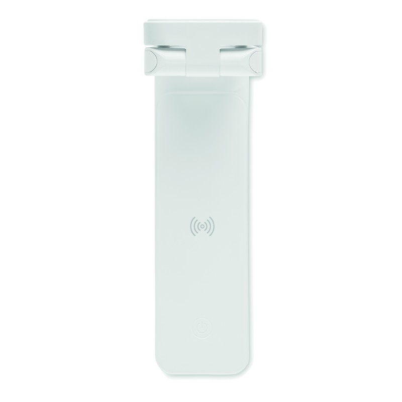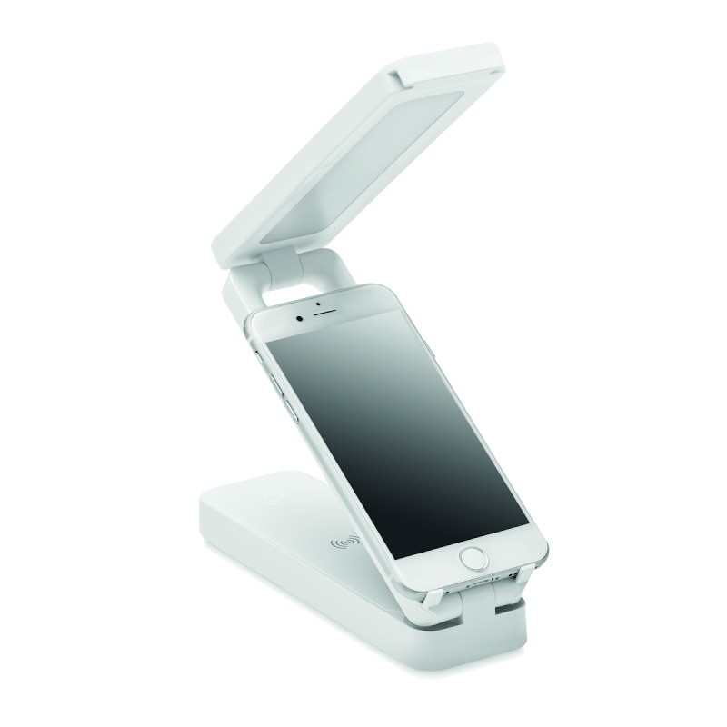 Lampe de bureau pliable en ABS avec 14 LED et 3 réglages de luminosité, chargeur sans fil 10W. Sortie : DC 9V/1.1A (10W) pour une charge rapide. Compatible derniers Androïdes, iPhone® 8 et plus récents.