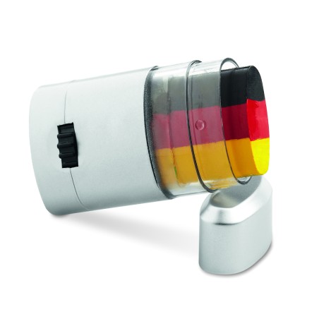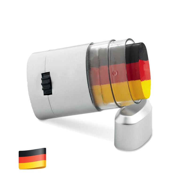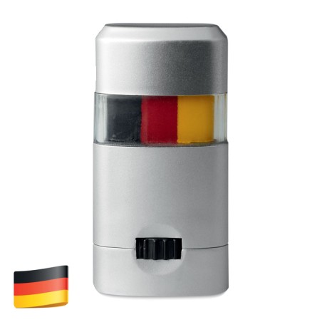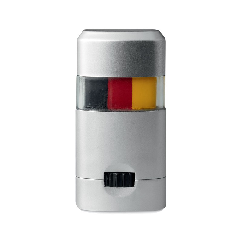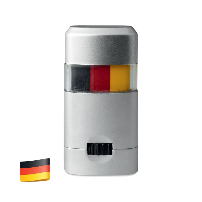 Bâtonnet de maquillage-drapeau présenté dans une boite argentée, avec fenêtre transparente au milieu.