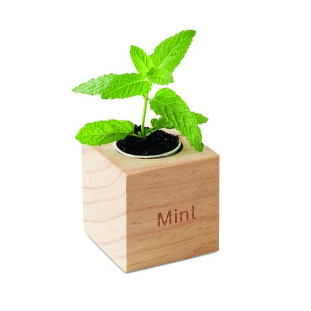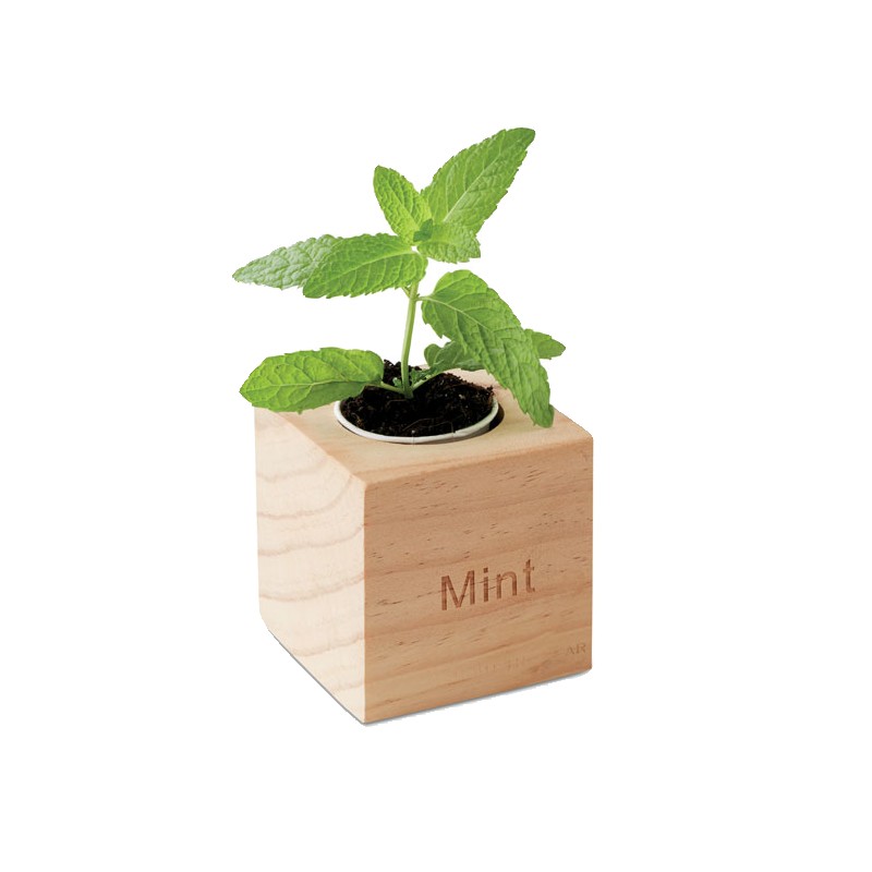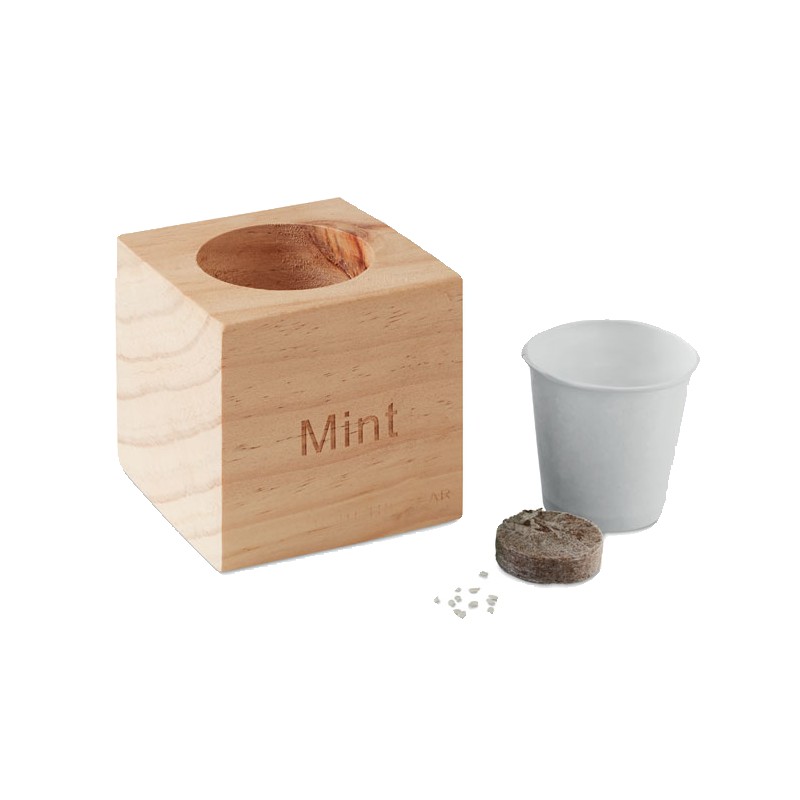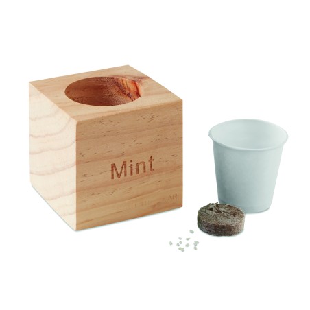 Pot en bois avec graine de menthe. Tablette de terreau incluse.
