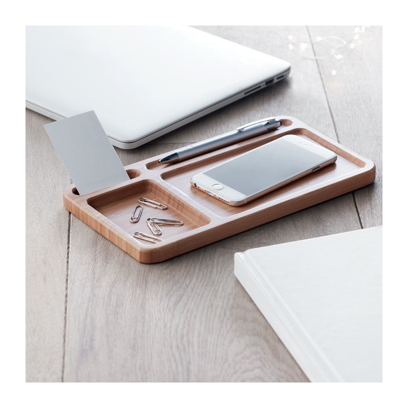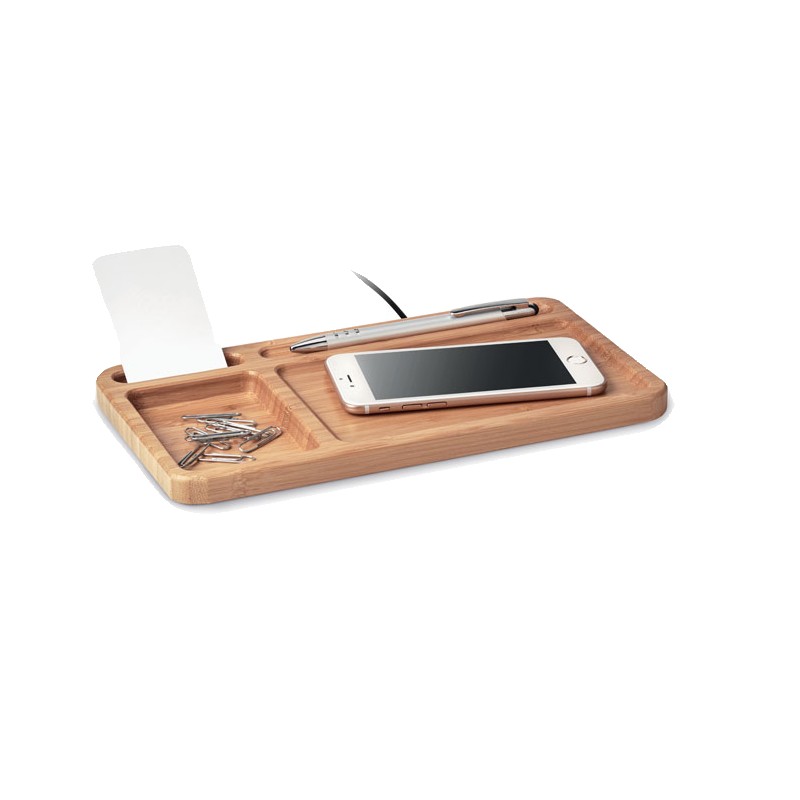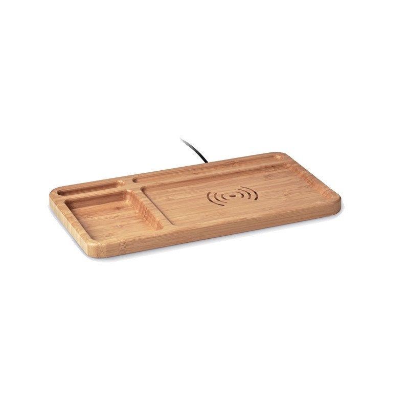 Boîte de rangement en bambou avec chargeur sans fil. Comprend un câble de chargement USB de 80cm. Sortie DC5V/1A (5W). Le bambou est un produit naturel, et présente de légères variations de couleur, de décoration et de tailles.