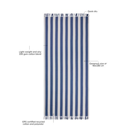 Cette serviette de plage hammam présente un motif classique à rayures bicolores avec des franges sur les petits côtés. Fabriquée dans un mélange léger et aéré de 200 g/m², elle allie le confort du coton aux avantages du séchage rapide du polyester. Mesurant 80x180 cm, il est parfait pour la plage ou le bord de la piscine. Certifié par GRS (Global Recycled Standard), la certification GRS garantit que l'ensemble de la chaîne d'approvisionnement des matériaux recyclés est certifiée. Le contenu recyclé total est basé sur le poids total du produit. Ce produit contient 68 % de coton recyclé certifié GRS et 29 % de polyester recyclé certifié GRS.