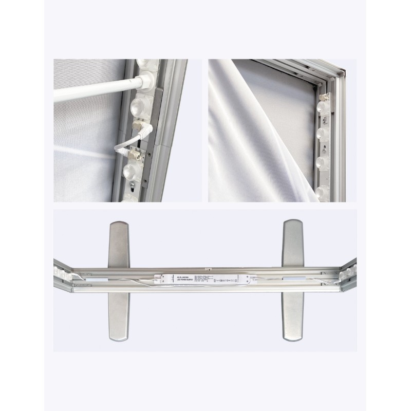 Enseignes lumineuses aussi appelées lightbox. Ces stands lumineux sont composés d'un châssis en aluminium d'épaisseur 8cm agrémenté de deux bandeaux de LED sur la hauteur, le tout reposant sur deux pieds larges pour garantir la stabilité. L'impression est réalisée en sublimation numérique sur une toile diffusante 190g/m² au recto-verso (recommandé) ou recto avec verso noir. Fixation des toiles par bande de silicone sur le contour du tissu. Le montage se fait par glissement du silicone dans la rainure du profilé aluminium. Changement de visuel en moins de 1 minute. L'ensemble est livré dans un sac de transport avec carton individuel. Utilisation indoor exclusivement. Nécessite une prise électrique 220V.