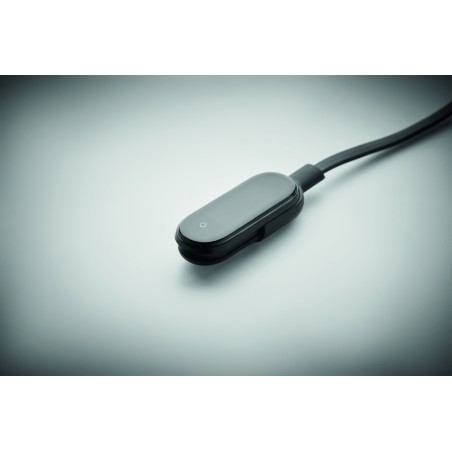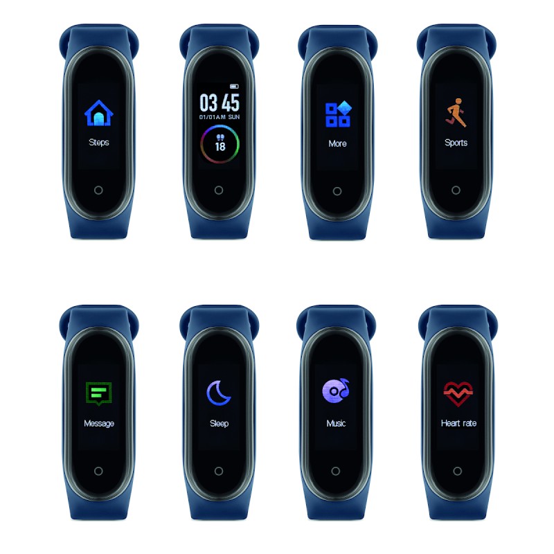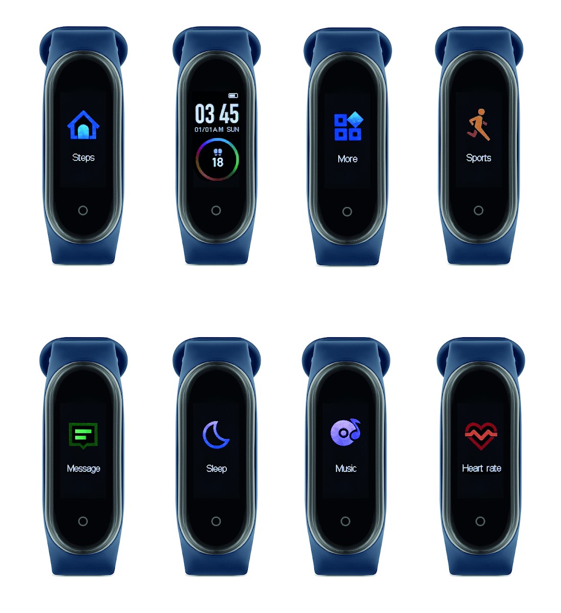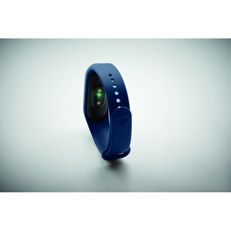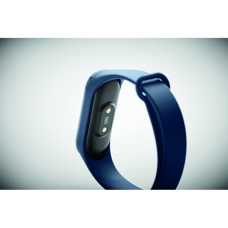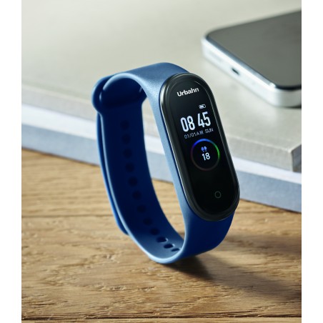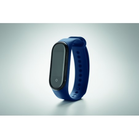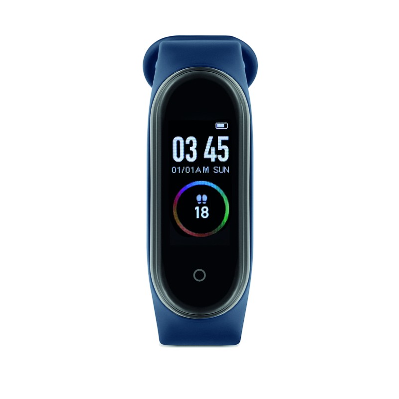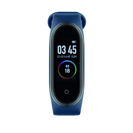 Montre santé sans fil 5.0 en ABS avec bracelet en silicone. Écran LCD tactile de 0,96 pouce. Batterie rechargeable Li-Pol 90 mAh. Nécessite une application gratuite (HryFine disponible sur iOS et Android).