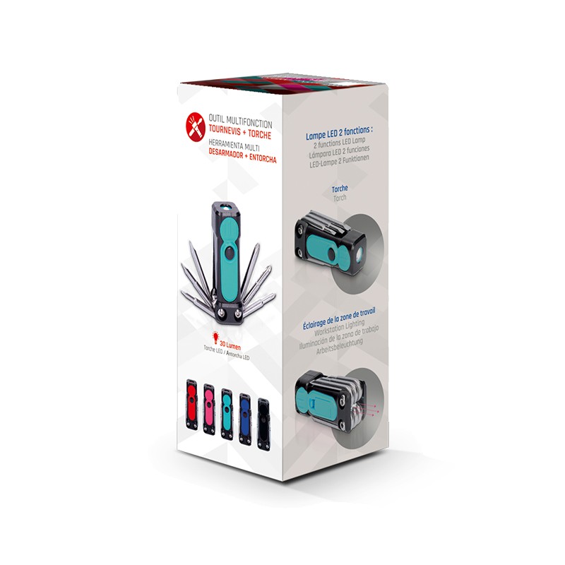 Dans la voiture, en rando, en vacances... Vous ne ferez plus un pas sans ce super-bricolo nomade qui rend de précieux services ! Kit outil multifonctions avec 6 tournevis (3 dimensions de tournevis plat et 3 dimensions de tournevis cruciforme). Avec double torche LED : 1 LED (30 lumens) + 1 LED pour l'éclairage de la zone de travail. Fonctionne avec 3 piles LR44 fournies. Livré en boite individuelle illustrée. Marquage en 1 couleur.