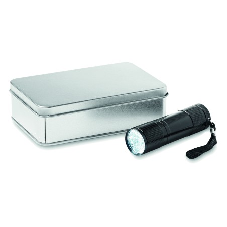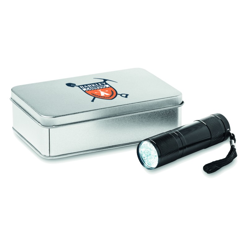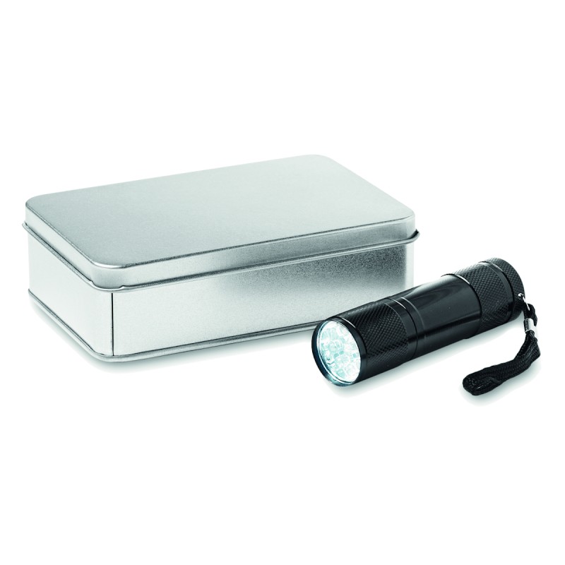 Torche aluminium 9 LED. 3 piles AAA et dragonne incluses. Présentée dans une boite métallique.