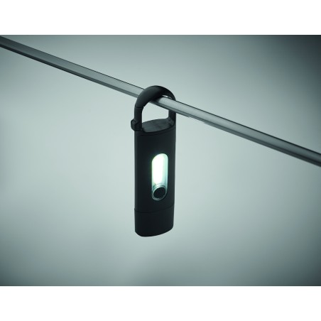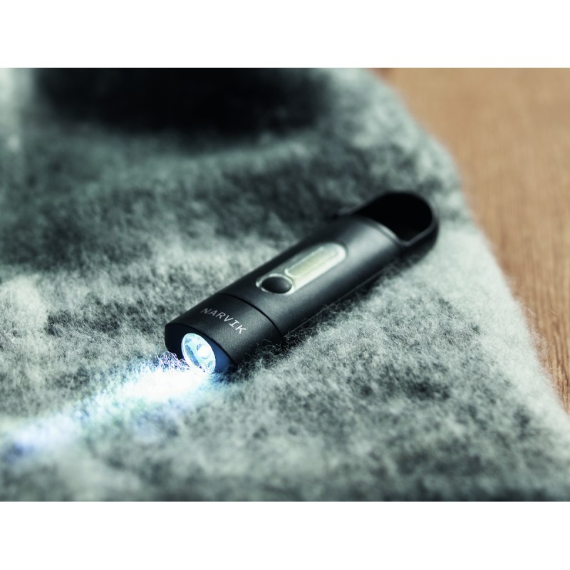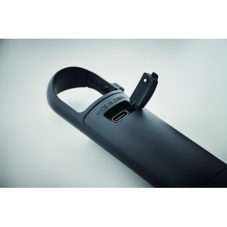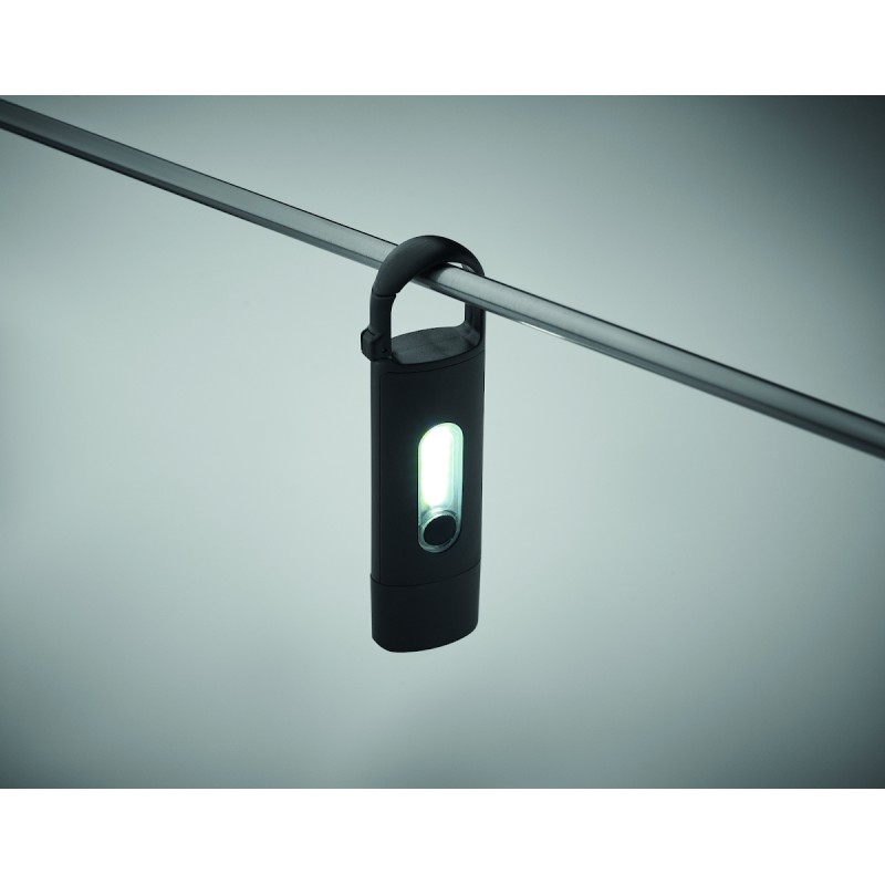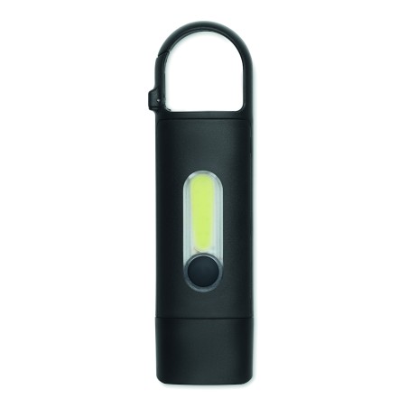 Lampe de poche COB rechargeable avec mousqueton en ABS. Lumière d'urgence et 3 modes d'éclairage. 1 pile rechargeable au lithium 3,7V, 200 mAh (incluse, non remplaçable).