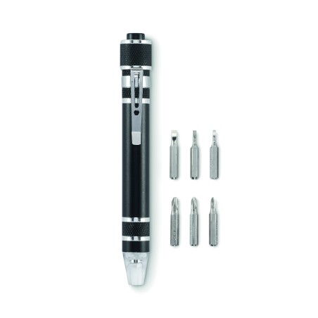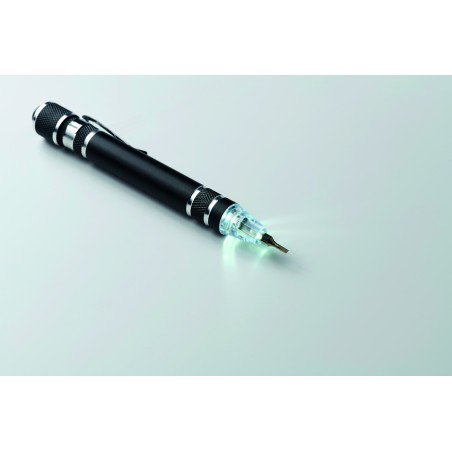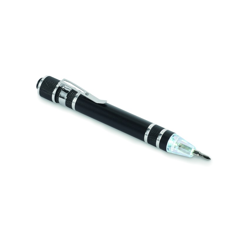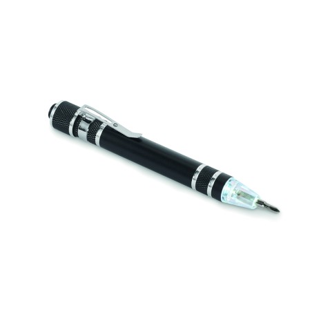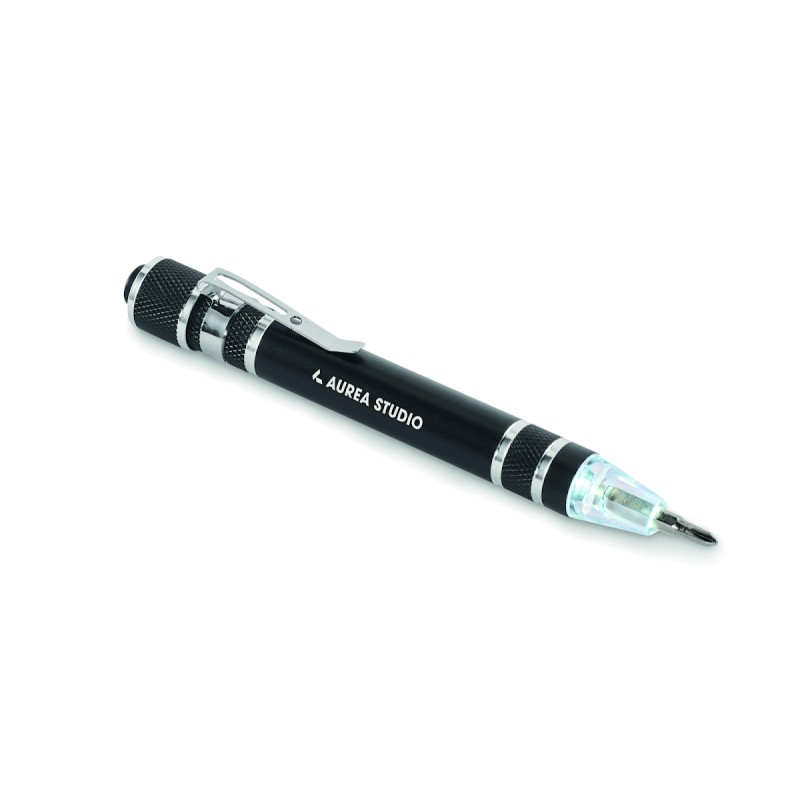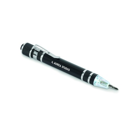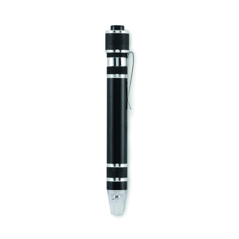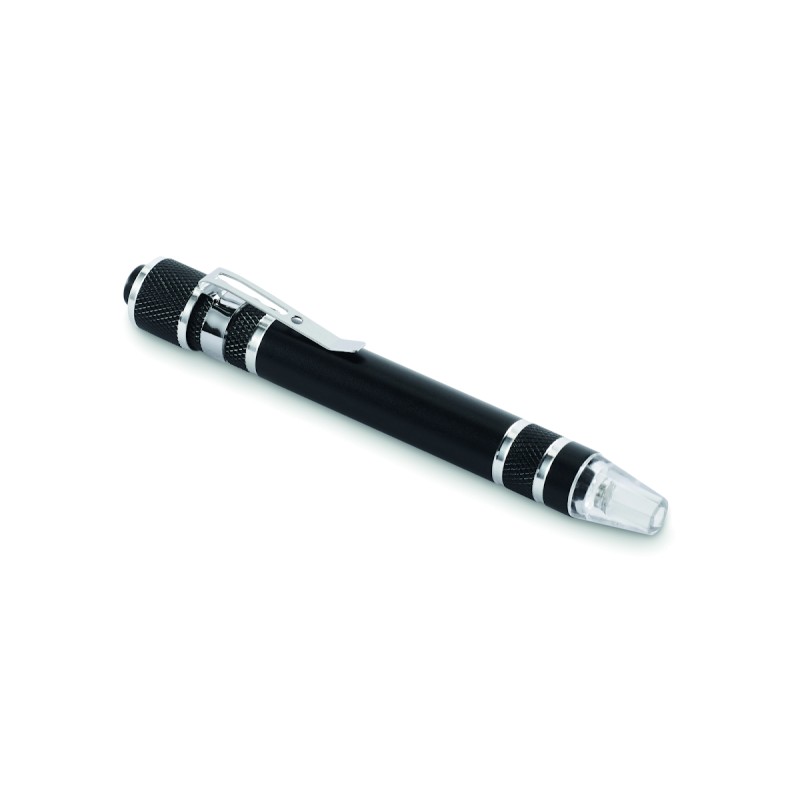 Outil multifonction en aluminium recyclé en forme de stylo avec lampe. Comprend 3 têtes de tournevis plats et 3 têtes de tournevis cruciformes. 4 piles bouton LR41 incluses.