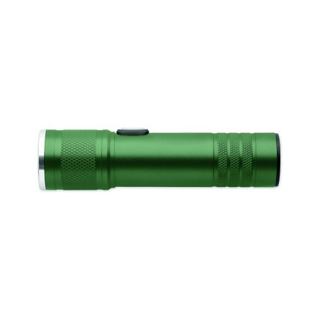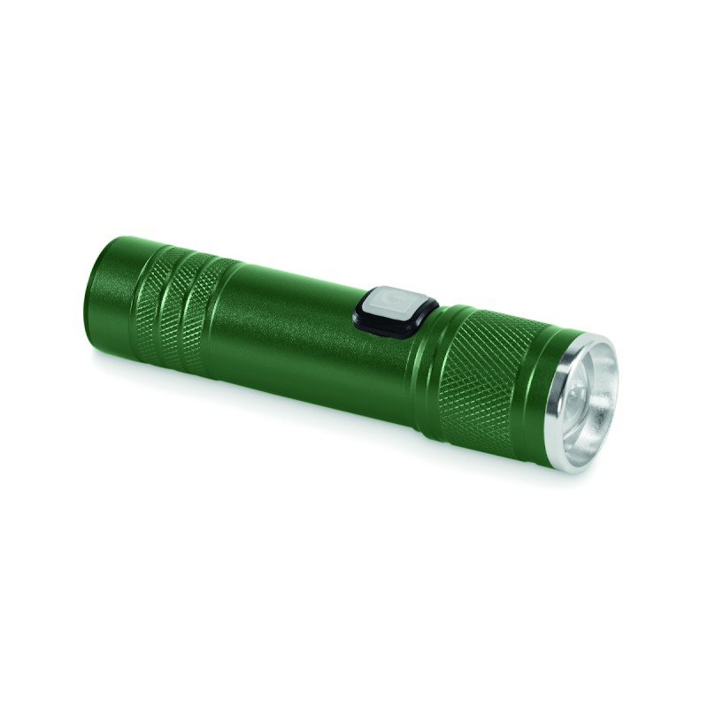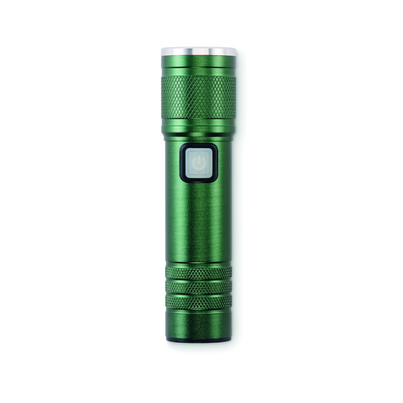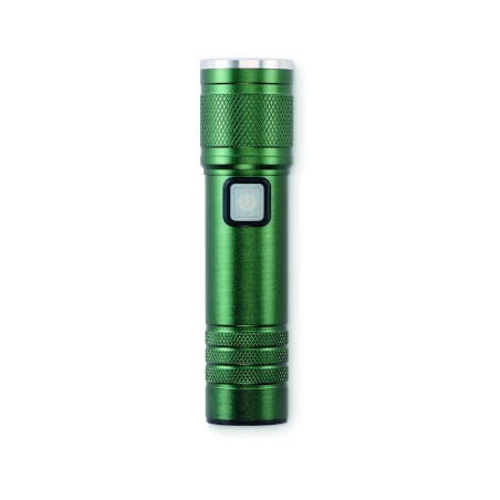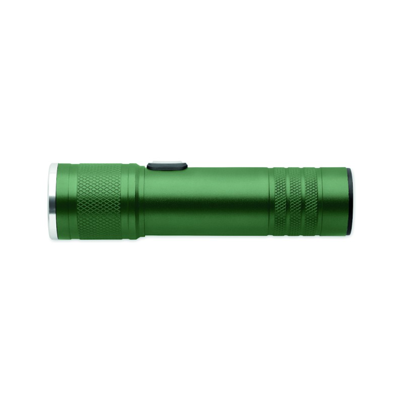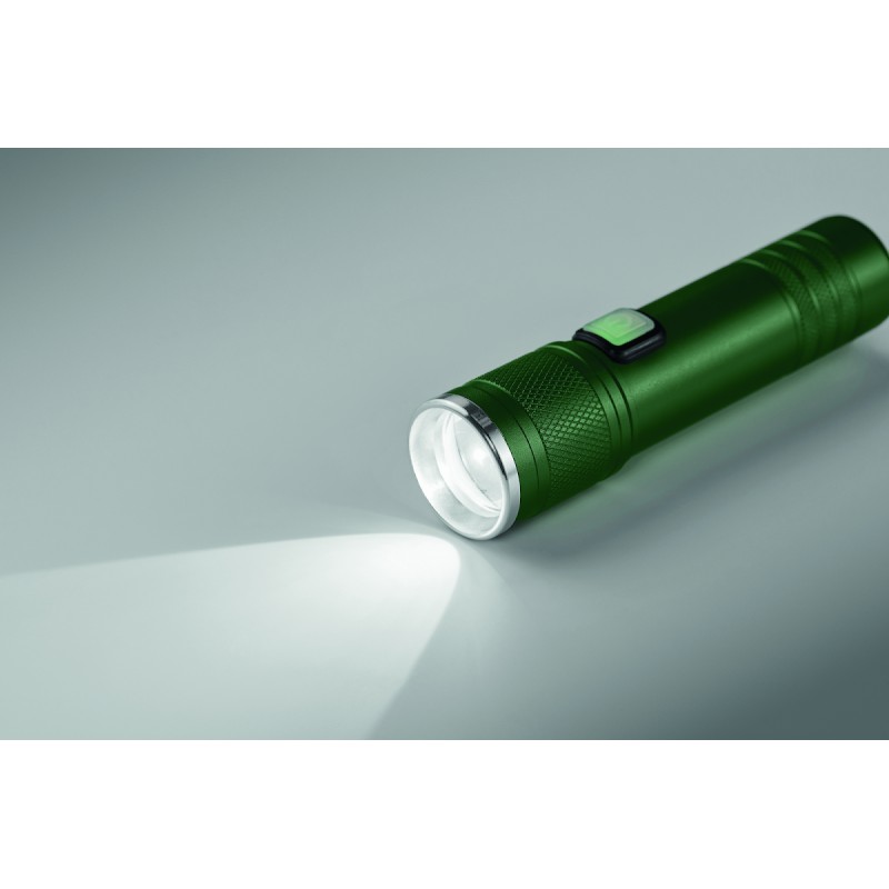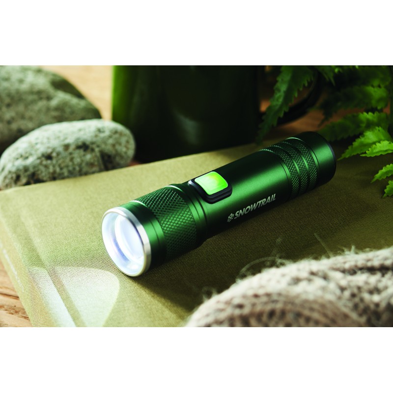 Lampe torche rechargeable et extensible en aluminium recyclé. 100 lumens avec 3 niveaux de luminosité et fonction zoom. Batterie rechargeable intégrée de 800 mAh. Câble de recharge inclus.