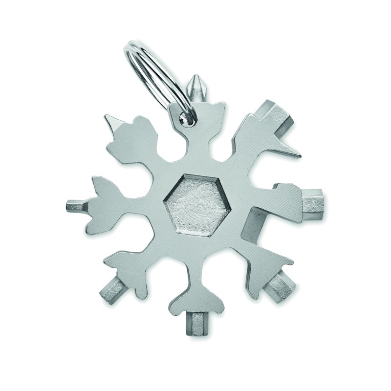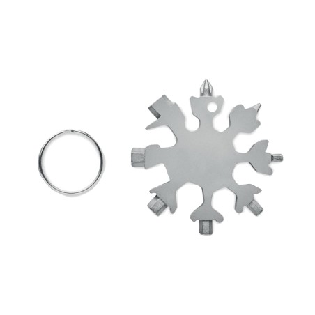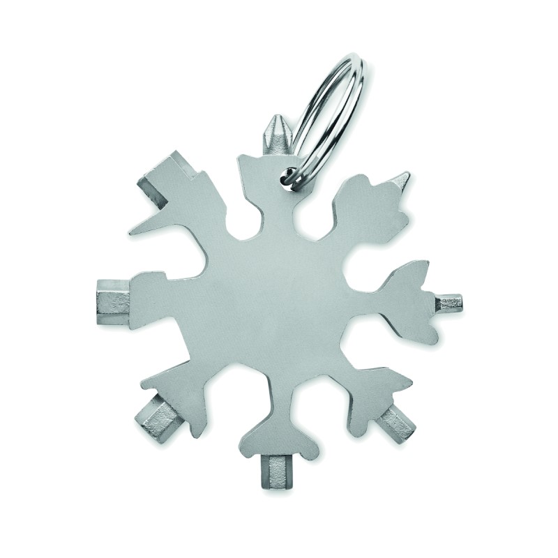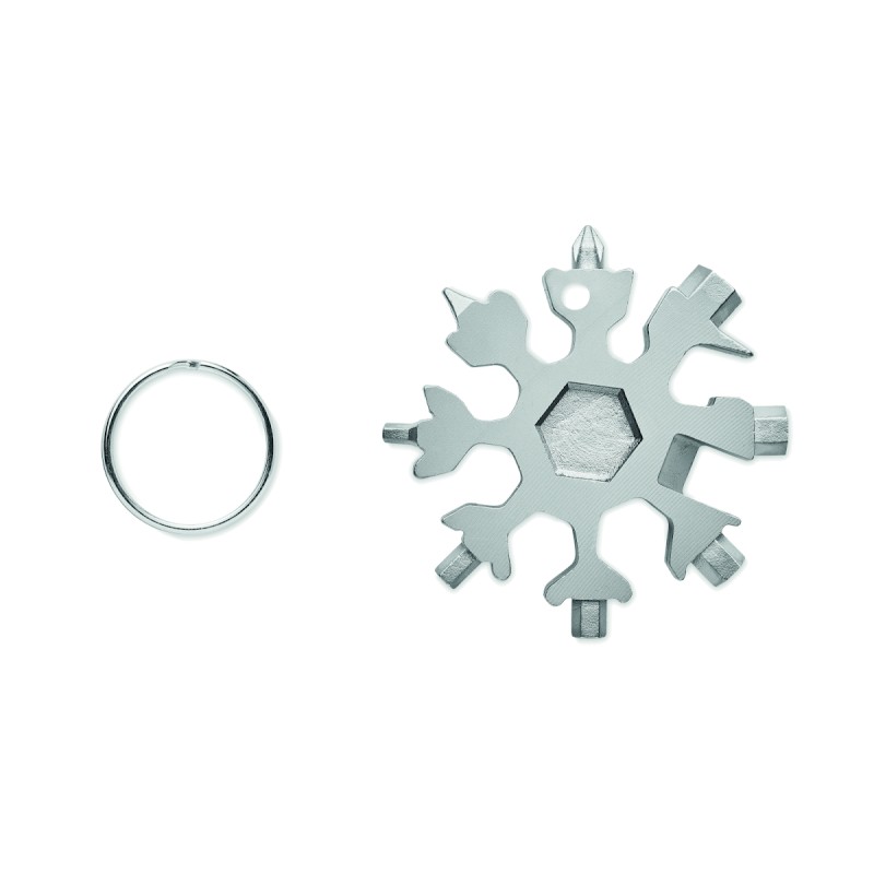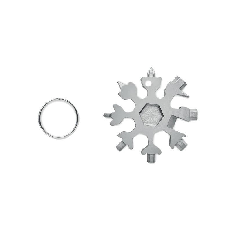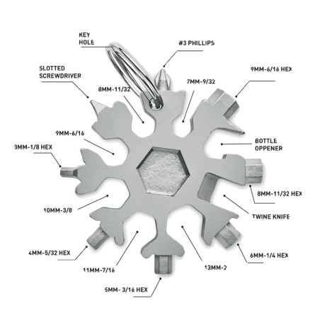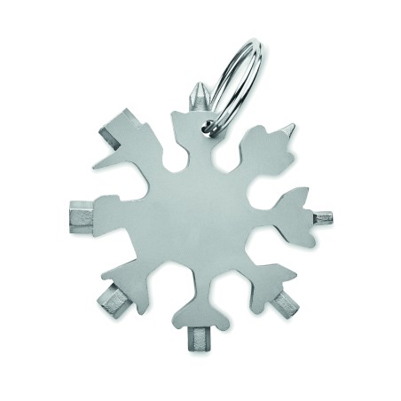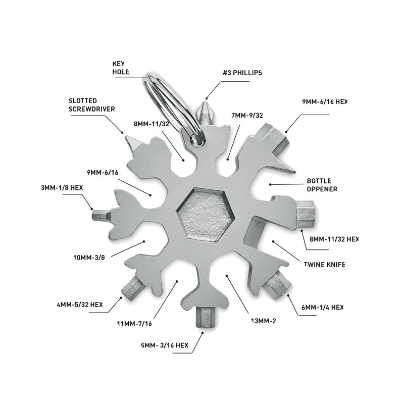 Outil Multifonctions 17-en-1 en acier inoxydable en forme de flocon de neige. Anneau métallique en option inclus.