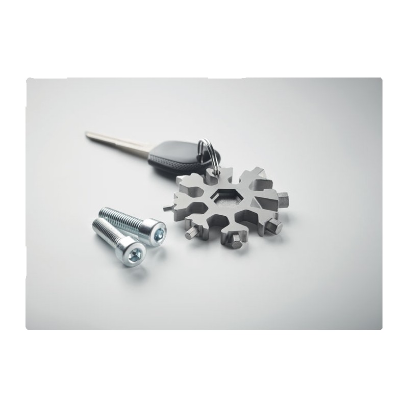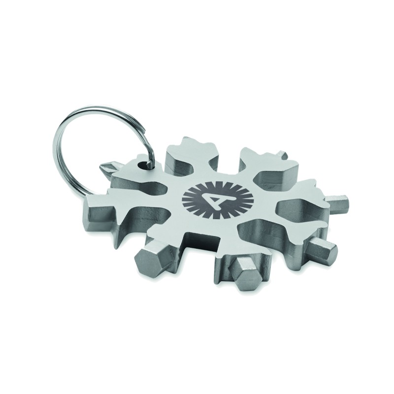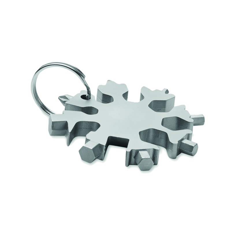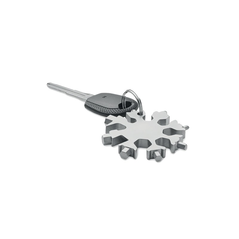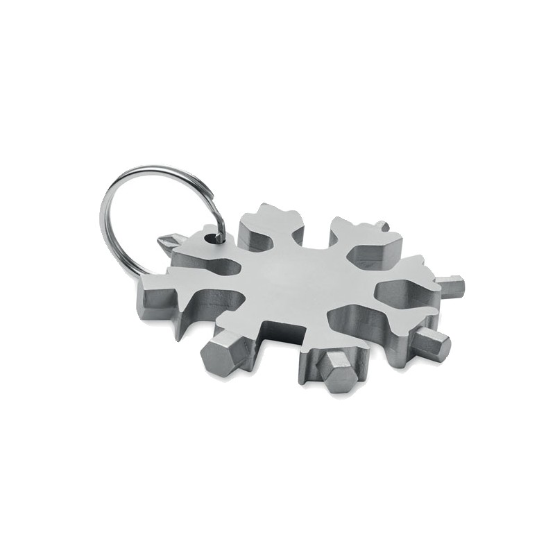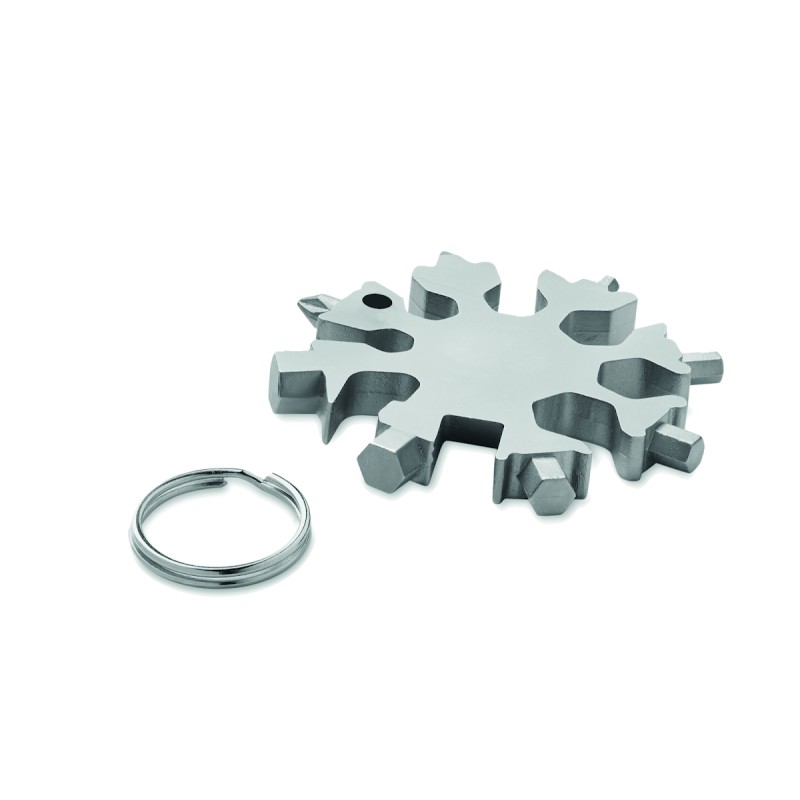 Outil Multifonctions 17-en-1 en acier inoxydable en forme de flocon de neige. Anneau métallique en option inclus.