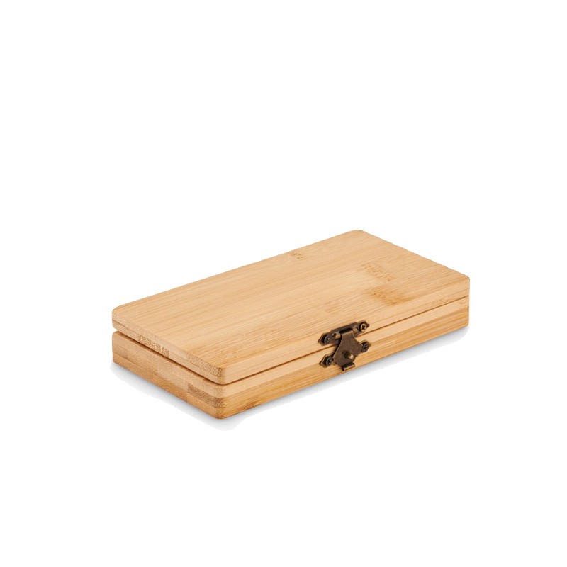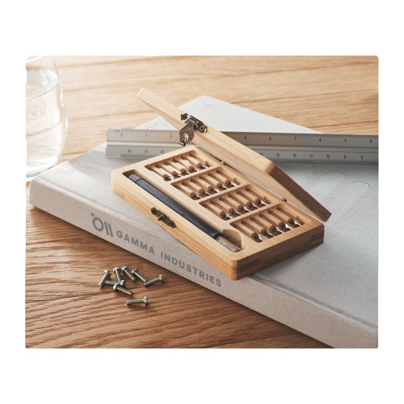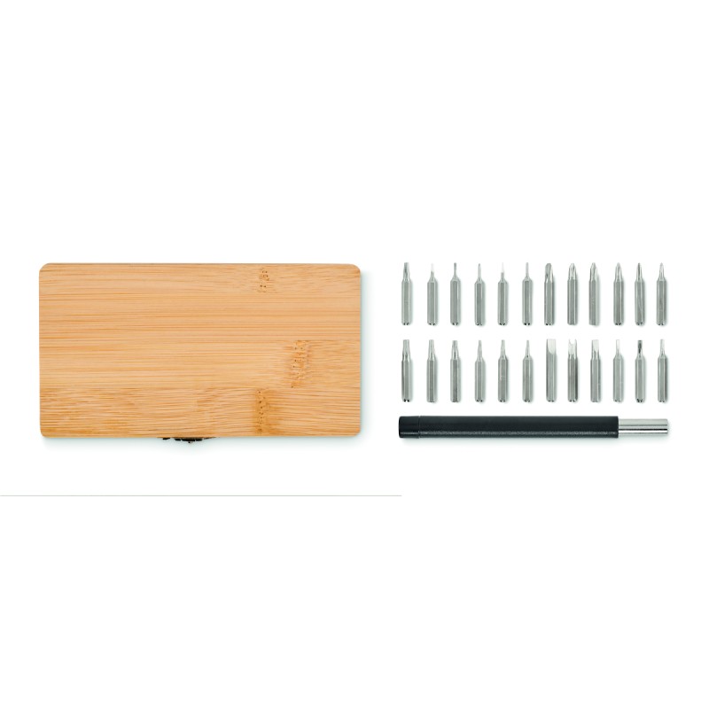 Petit kit d'outils de réparation tournevis de précision 24 pièces dans un étui en bambou avec fermeture à boucle. Le bambou est un produit naturel, et présente de légères variations de couleur, de décoration et de tailles.