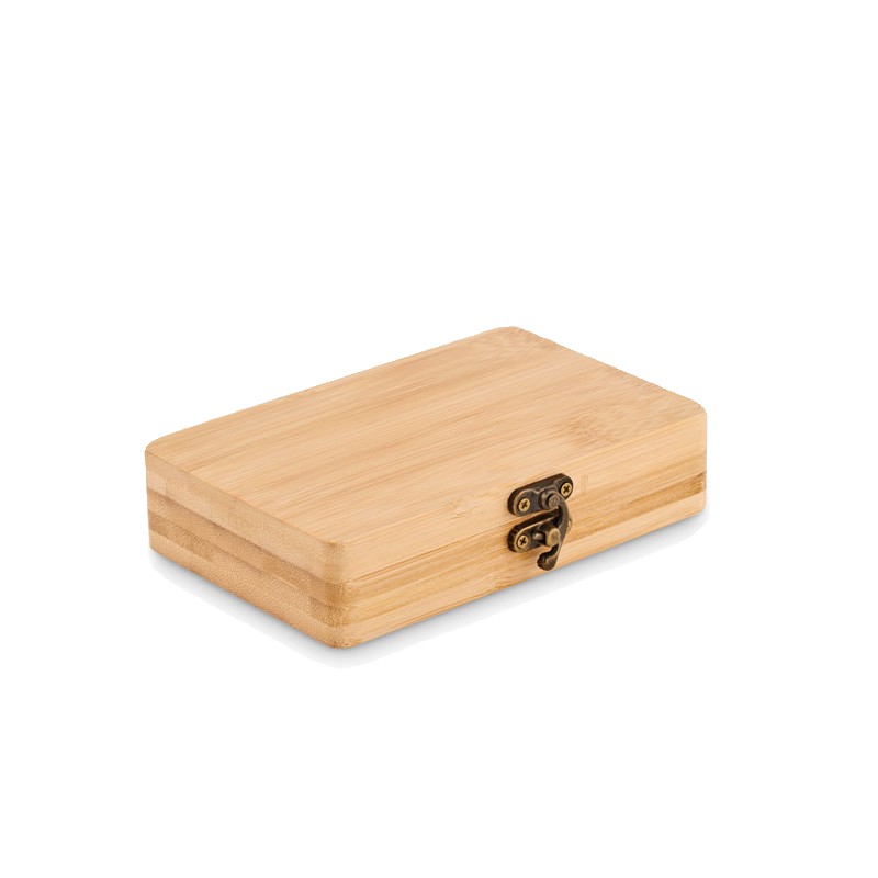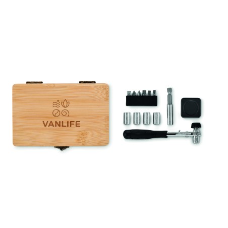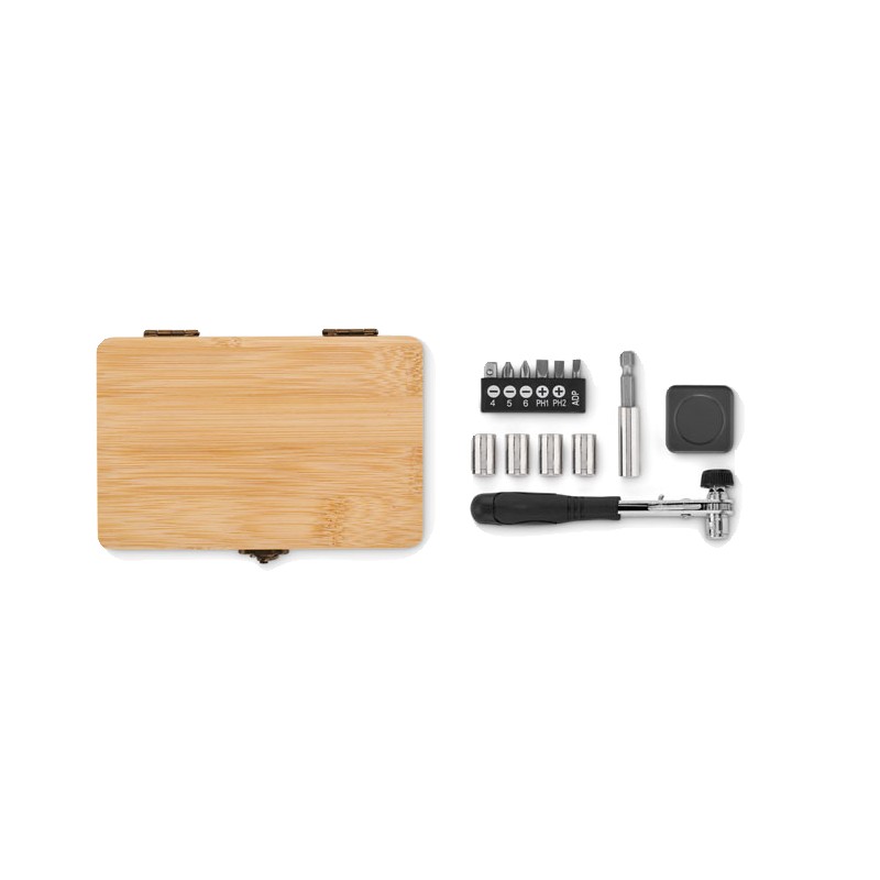 Ensemble d'outils de 13 pièces présenté dans un étui en bambou contenant 6 embouts dans un support avec : 3 embouts (4, 5, 6mm), 2 tailles Philips (PH1, PH2) et 1 adaptateur, 4 douilles (7mm, 8mm, 9mm, 10mm), 1 manche, 1 connecteur et 1 ruban de mesure. Le bambou est un produit naturel, et présente de légères variations de couleur, de décoration et de tailles. FSC®-certified | FSC 100%, N5.7, FSC-C213206