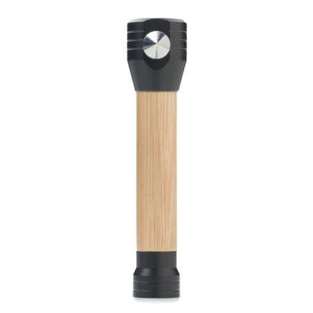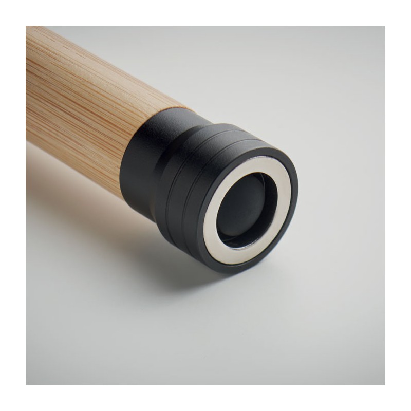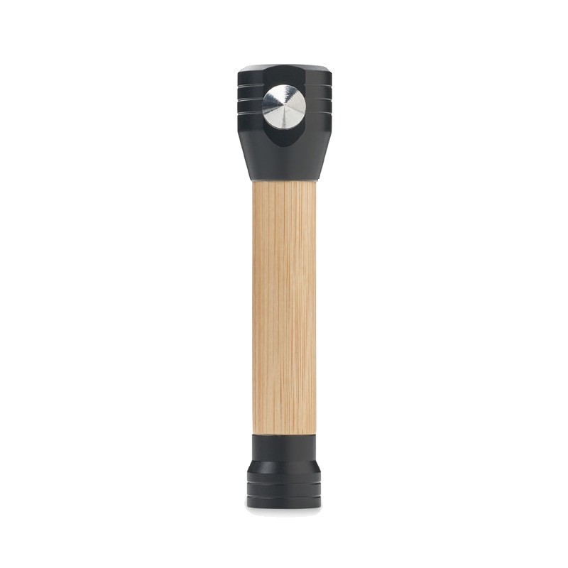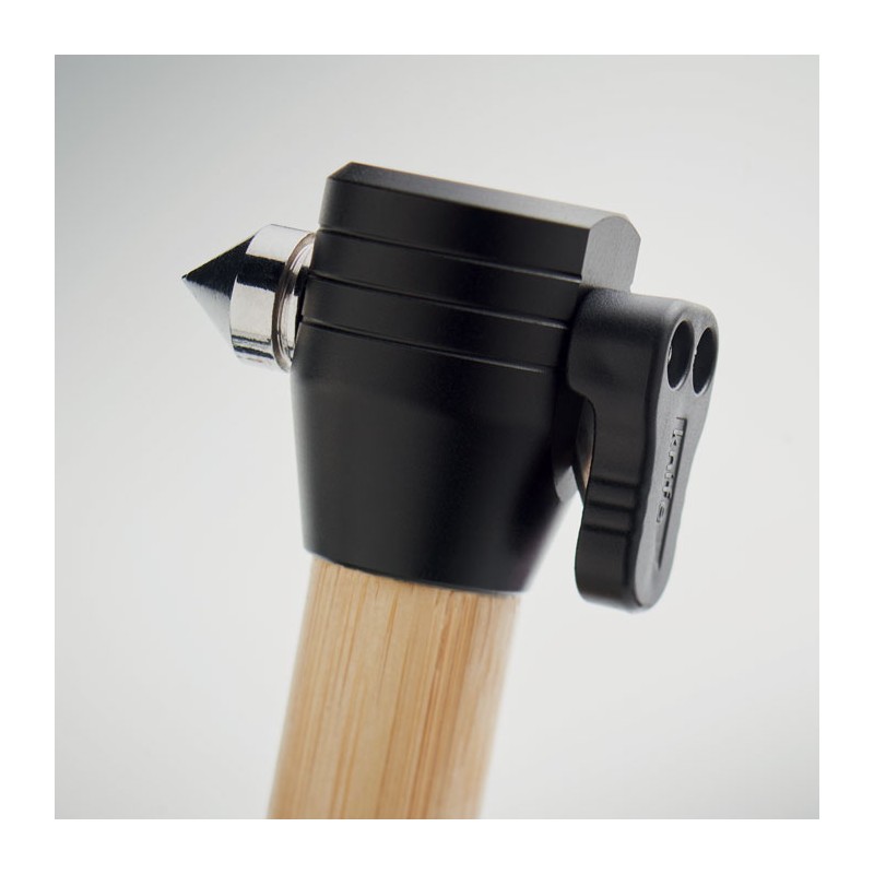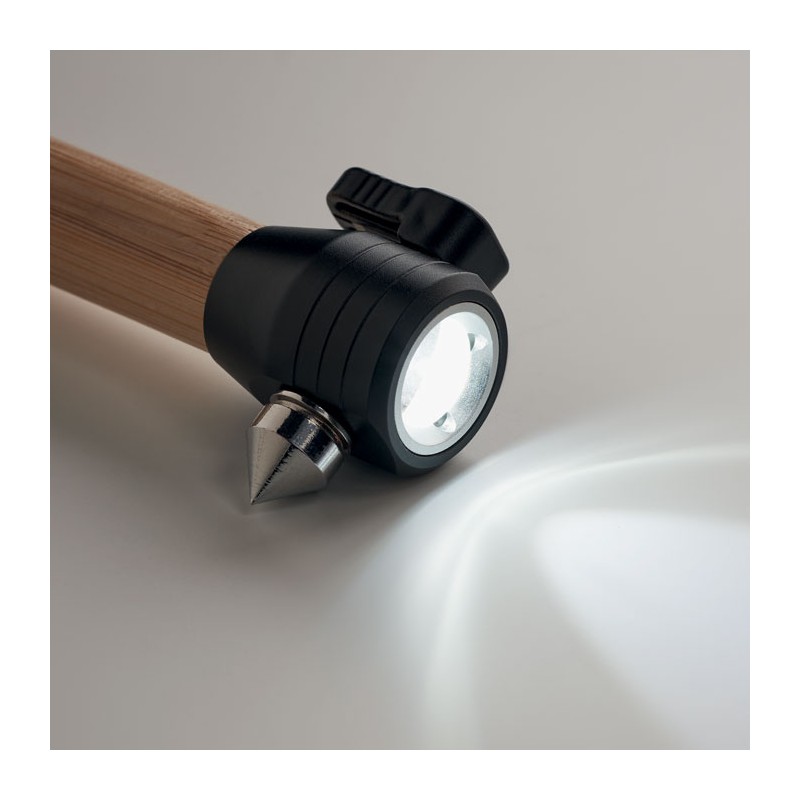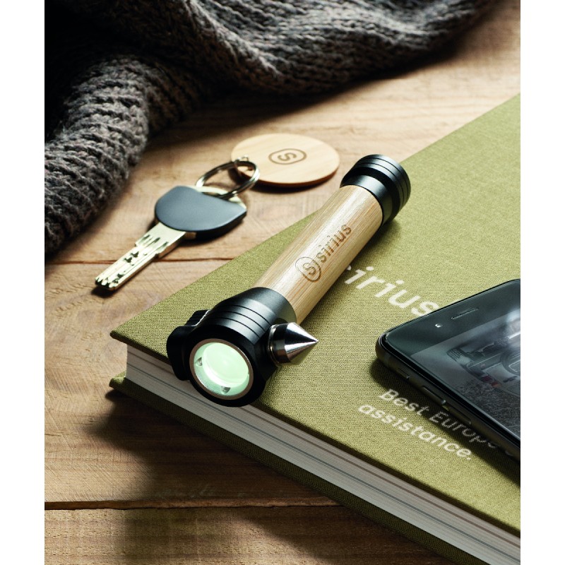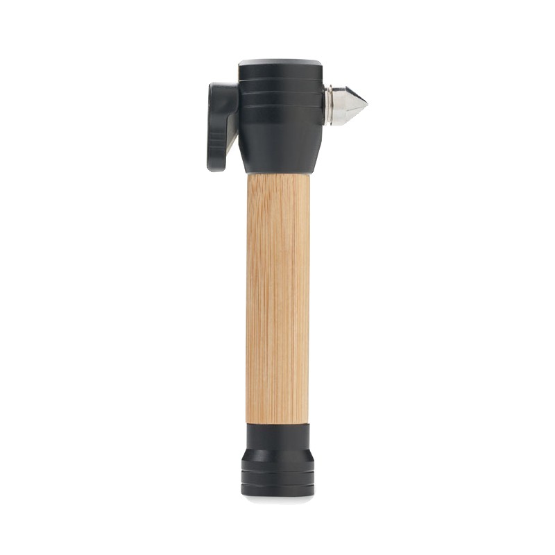 Torche en bambou 3 en 1 avec marteau de sécurité et coupe-ceinture. Base magnétique. Luminosité de sortie : 60. 2 piles AAA non-incluses. Le bambou est un produit naturel, et présente de légères variations de couleur, de décoration et de tailles.
