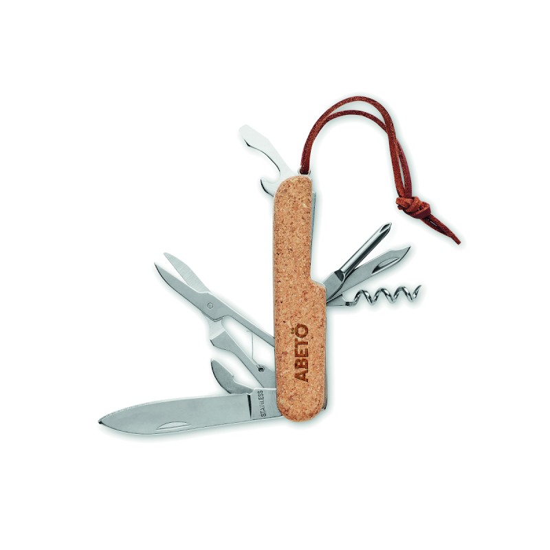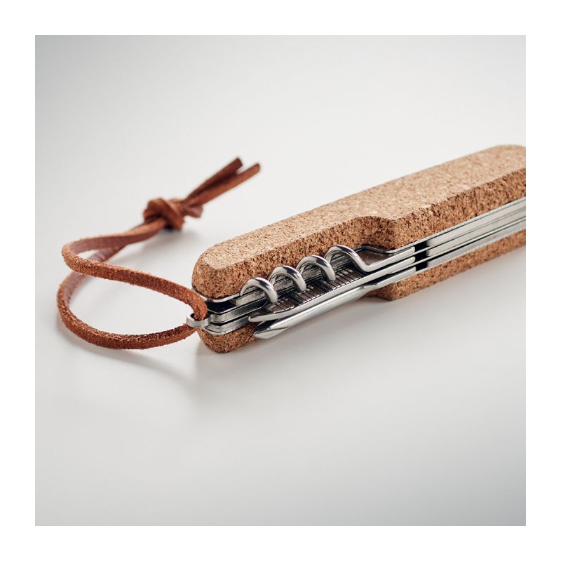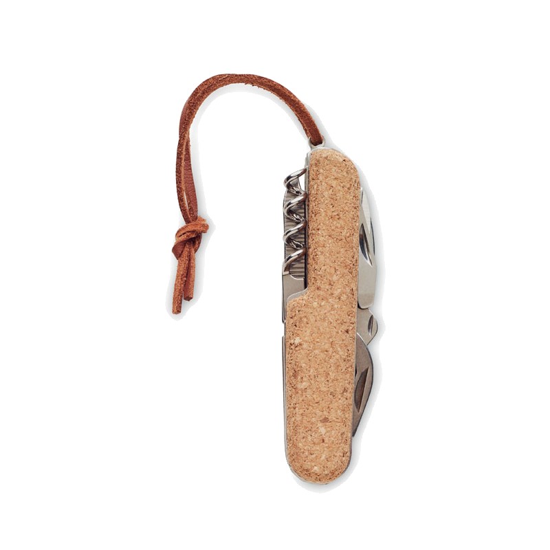 Couteau de poche multifonctions en acier inoxydable avec revêtement en liège et cordon en PU. 7 fonctions Ouvre-boîte, décapsuleur, couteau, ciseaux, tournevis cruciforme, lime et ouvre-bouteille Le liège est un matériau 100% naturel. En raison de sa structure et de la porosité de sa surface, le résultat final de l'impression par article peut présenter des différences.