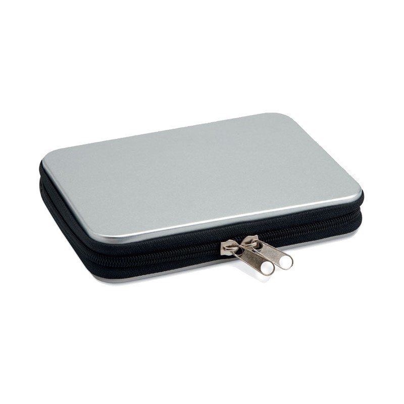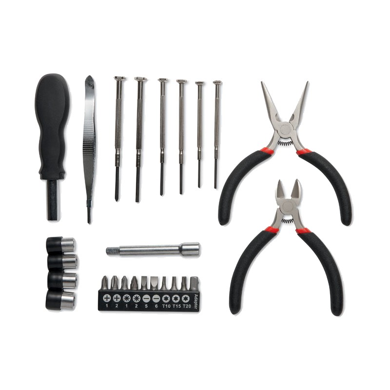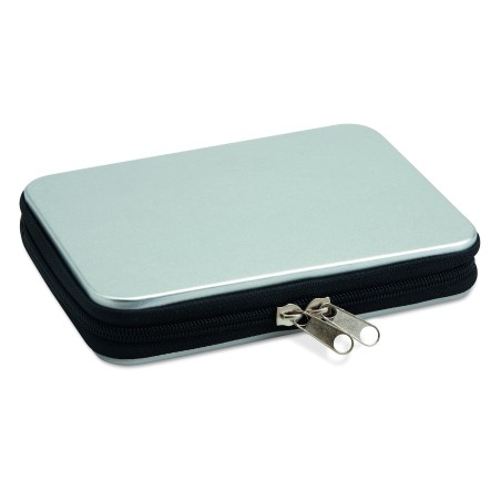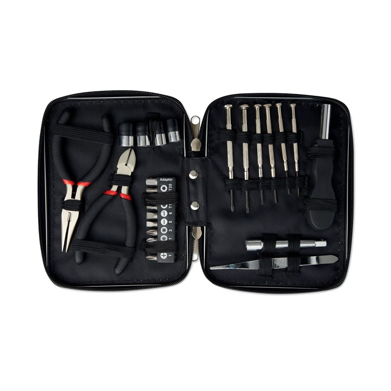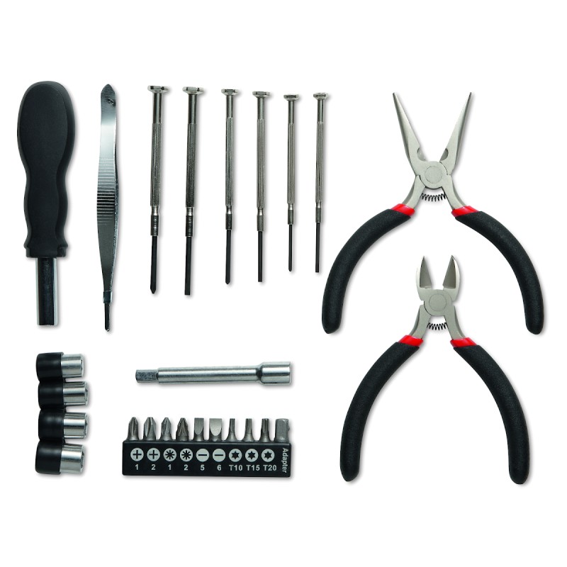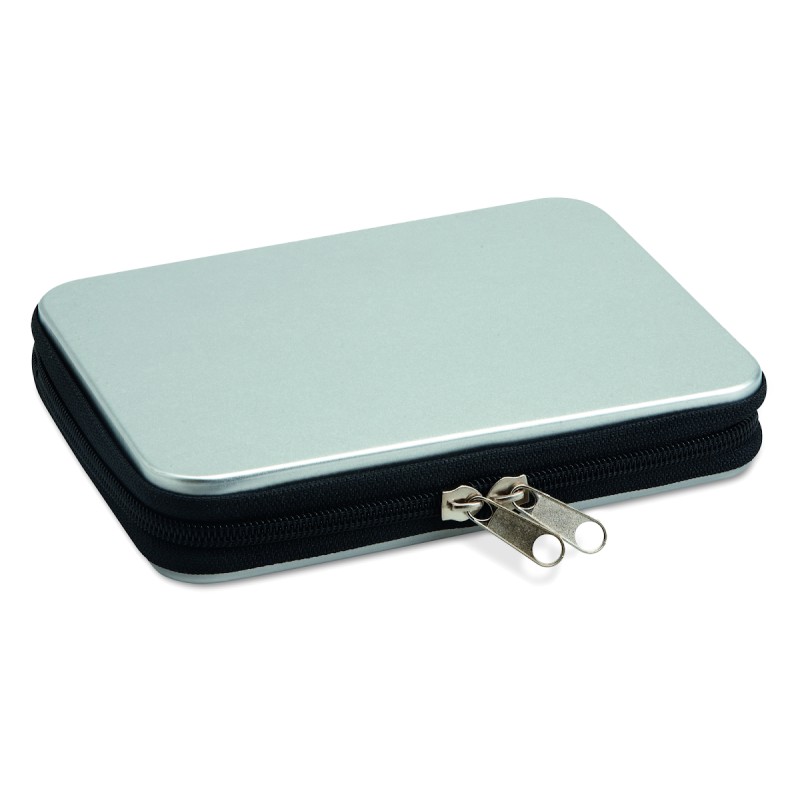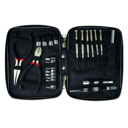 Jeu d'outils présenté dans une boite en aluminium contenant 1 pince, 1 pince coupante, 1 tournevis , 1 rallonge, un ensemble de 10 embouts, 1 mini pince et 6 tournevis de précision.