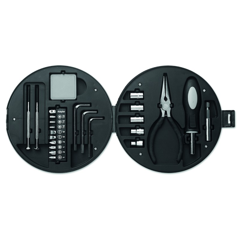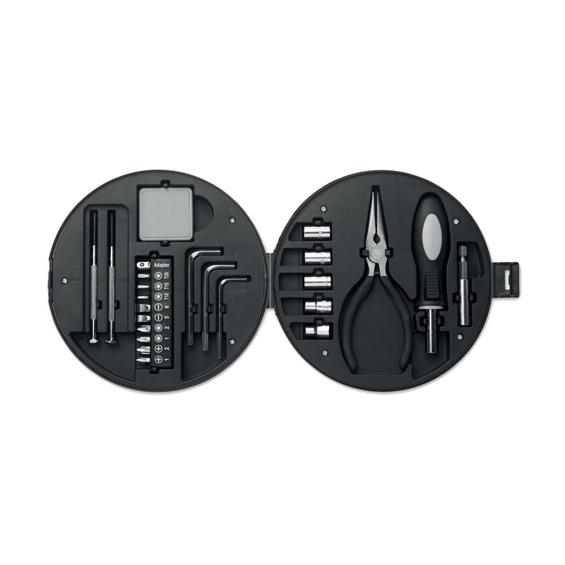 Set d'outillages 25 pièces en forme de Roue. 1 extenseur, 1 fiche de tournevis, 1 pince plate, 5 douilles, 3 clés, 10 embouts, 2 tournevis de précision et un ruban.