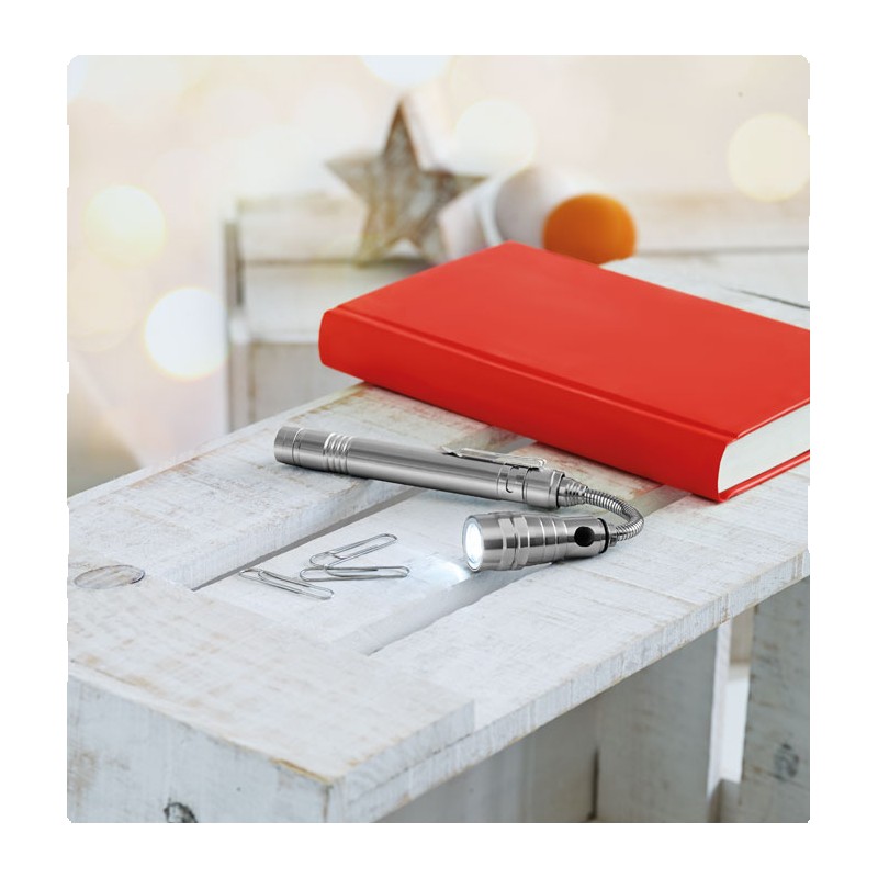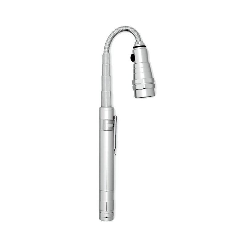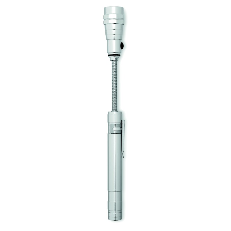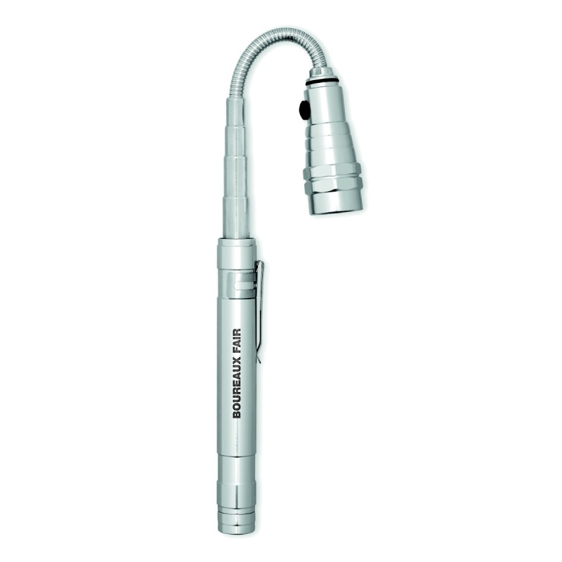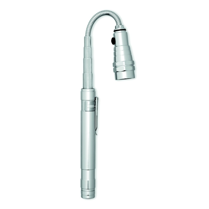 Lampe extensible en aluminium avec aimant sur le dessus et clip latéral. 4 piles LR44 incluses. Longueur max 57cm.