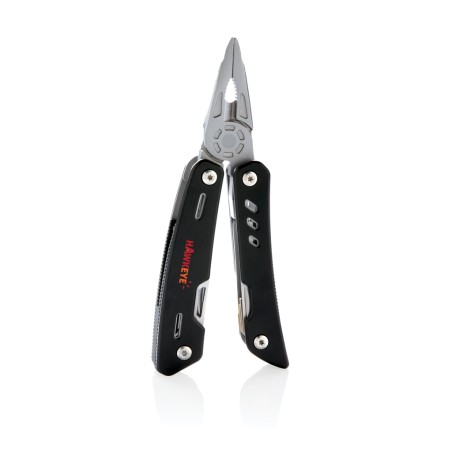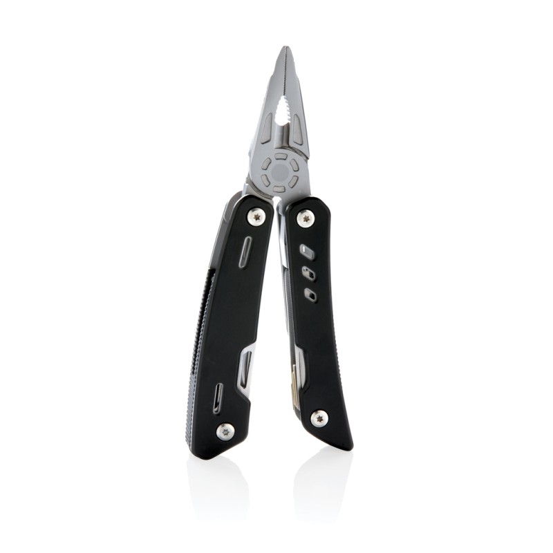 Outil multifonctions robuste en aluminium avec 12 fonctions. Les outils en acier inoxydable sont: pince à bec, pince, pince coupante, couteau, tournevis cruciforme, petit tournevis plat, scie, ouvre-boite, décapsuleur, lame dentelée, poinçon et lime. E