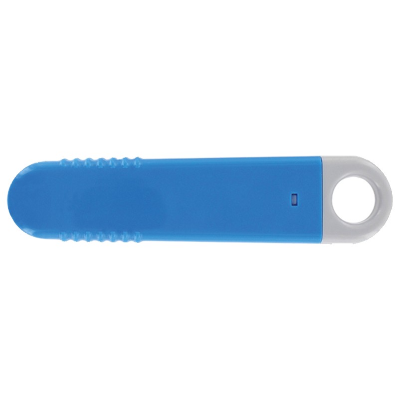 "Cutter ""de sécurité"" pour droitier ou gaucher, lame trapézoïdale standard auto-rétractable. Grande surface de marquage. "