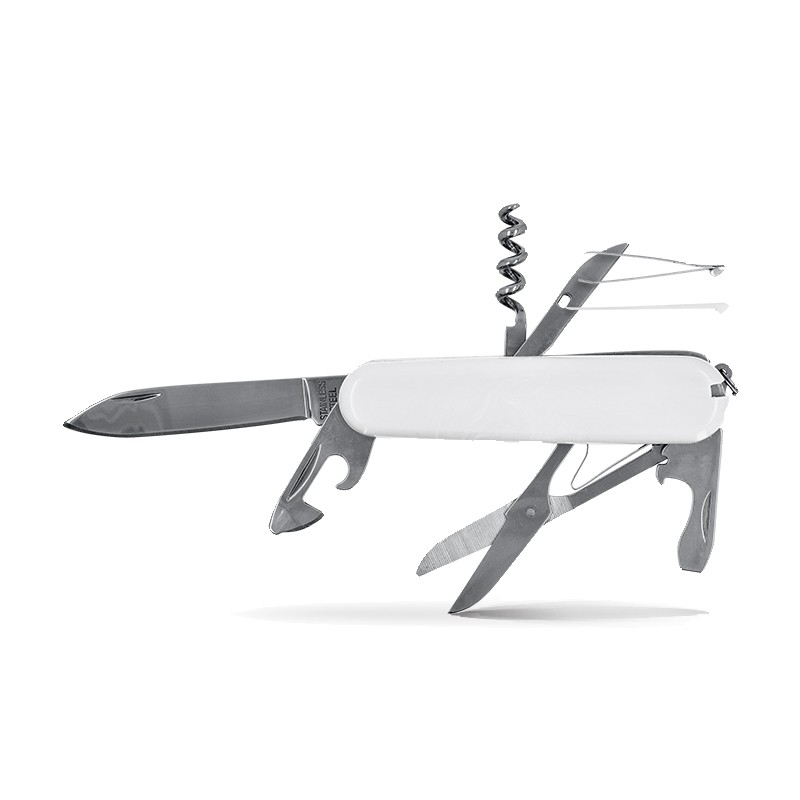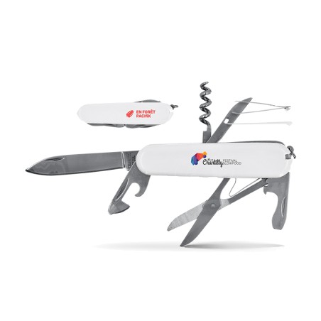 Un grand classique, couteau multifonction 8 attributs, 11 fonctions dont tire-bouchon et ciseaux... Livré en boîte individuelle blanche. Marquage en 1 couleur ou Quadrinumérique ou Quadrinumérique nominatif.