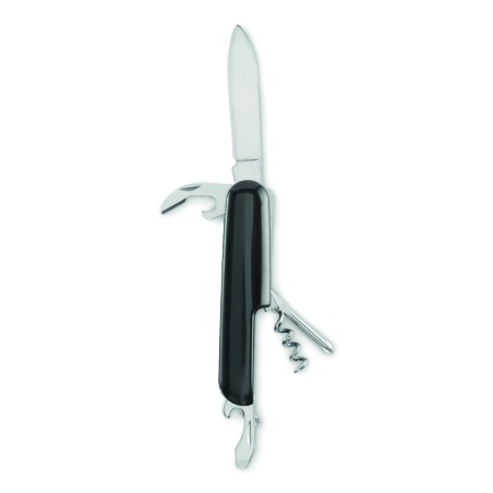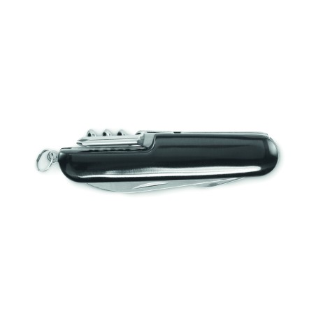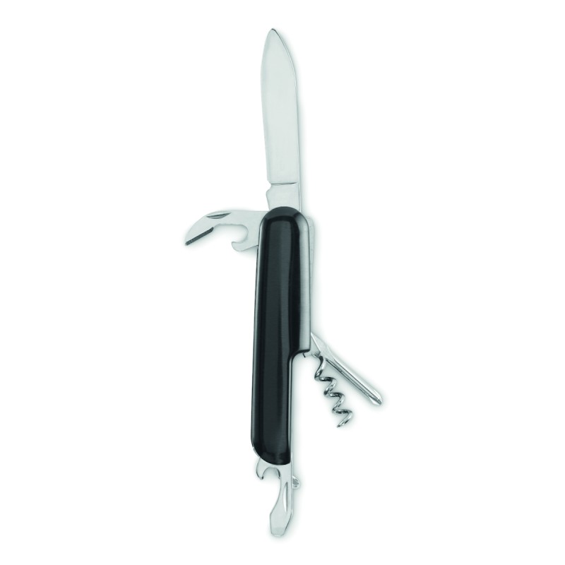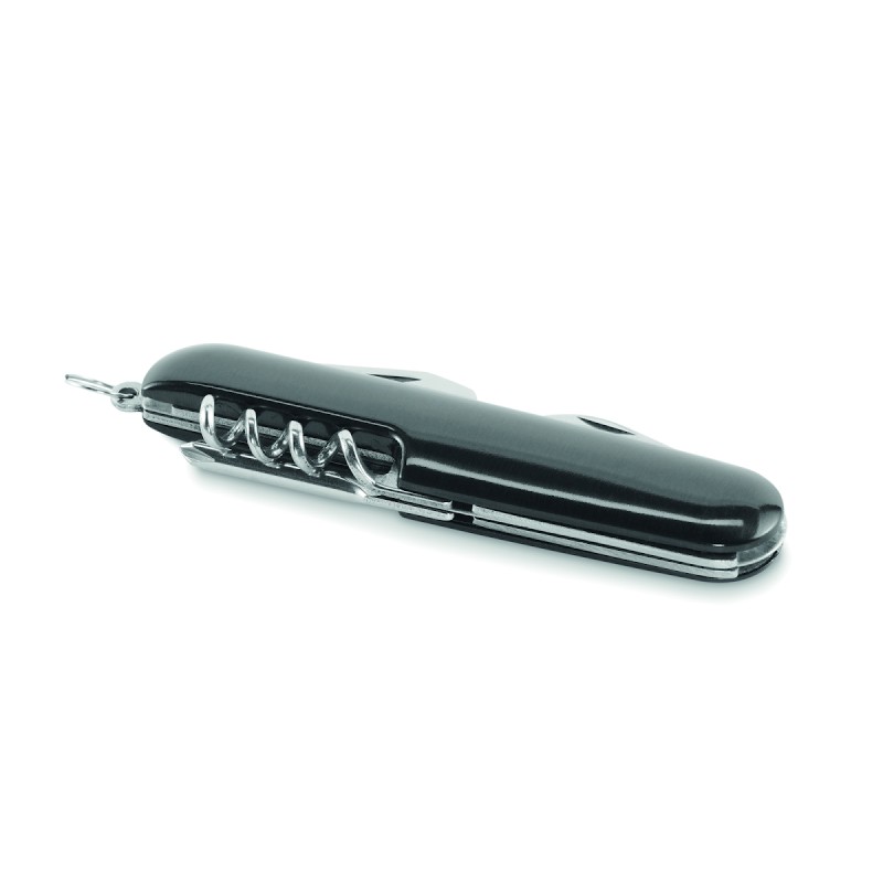 Couteau de poche multifonction en aluminium recyclé. 5 fonctions : grande lame, décapsuleur, tournevis, tire-bouchon et ouvre-boîte.
