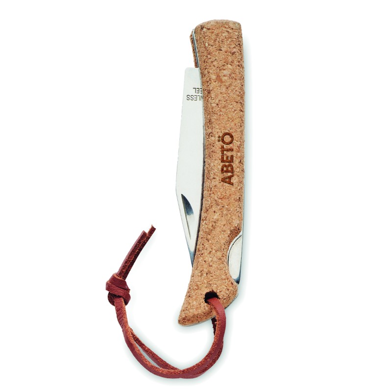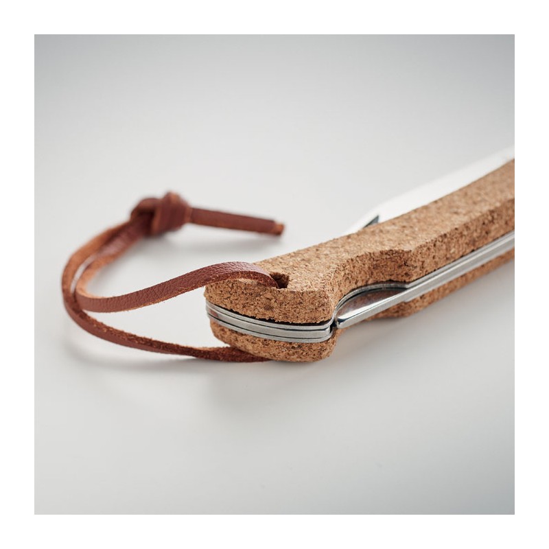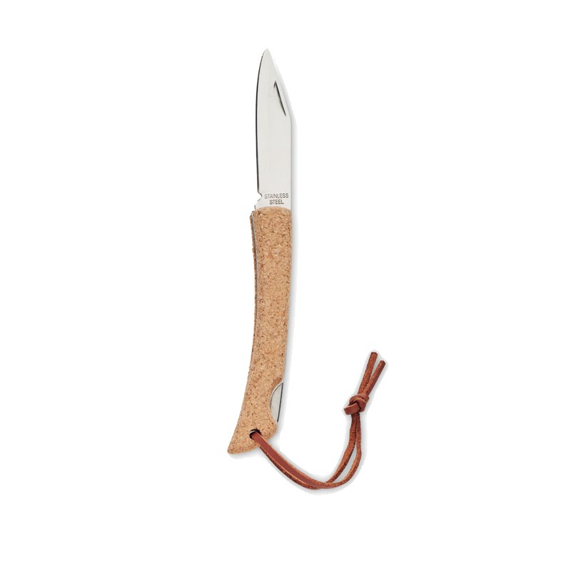 Couteau pliable en acier inoxydable avec manche recouvert de liège et cordon en PU. Le liège est un matériau 100% naturel. En raison de sa structure et de la porosité de sa surface, le résultat final de l'impression par article peut présenter des différences.
