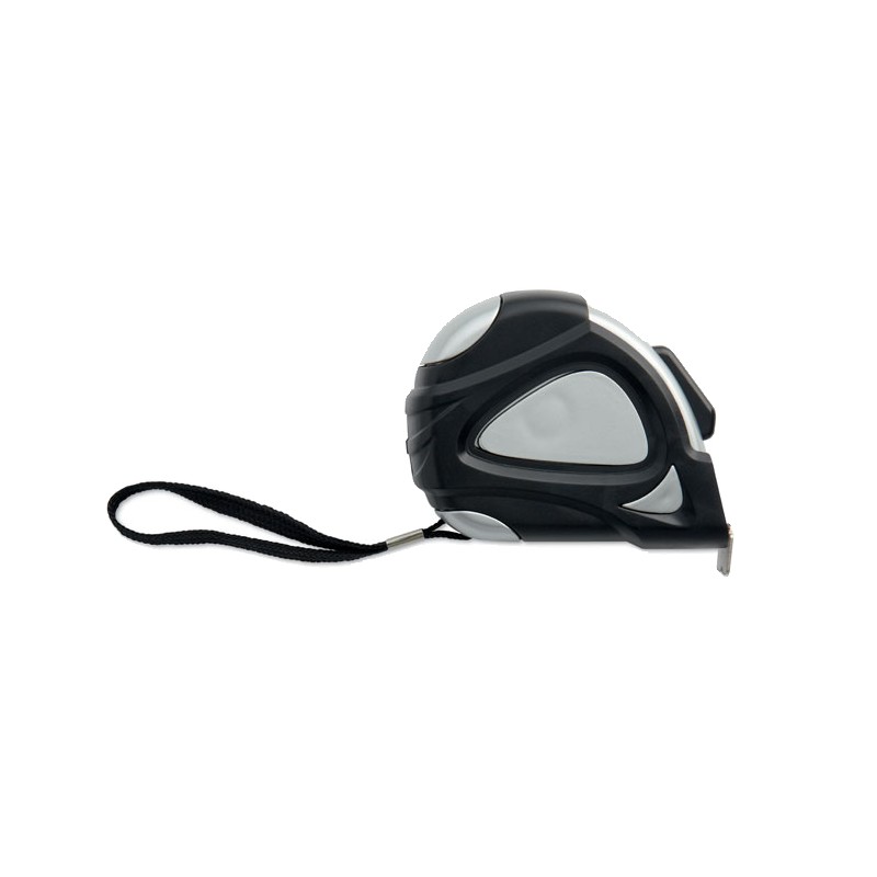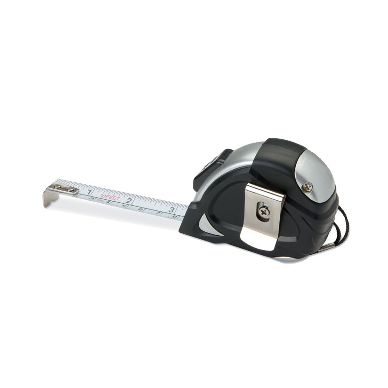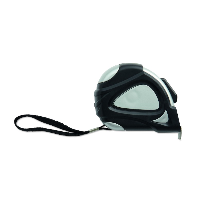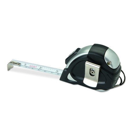 Mètre 3 m en ABS. Boitier argenté. Avec dragonne et clip métallique en argent brillant.