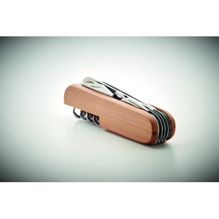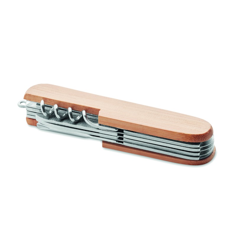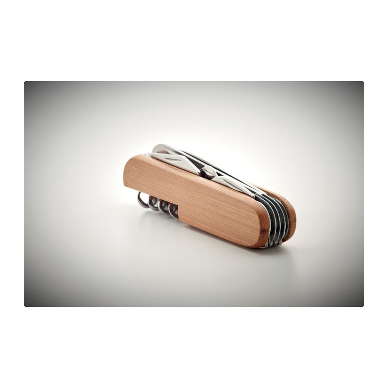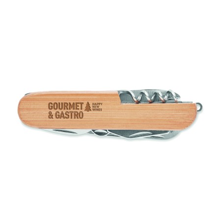 Couteau de poche multi-outils en acier inoxydable avec une surface en bambou. 9 fonctions. Le bambou est un produit naturel, il peut y avoir de légères variations de couleur et de taille par article.