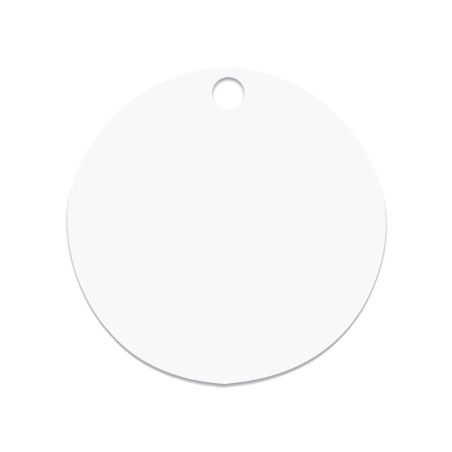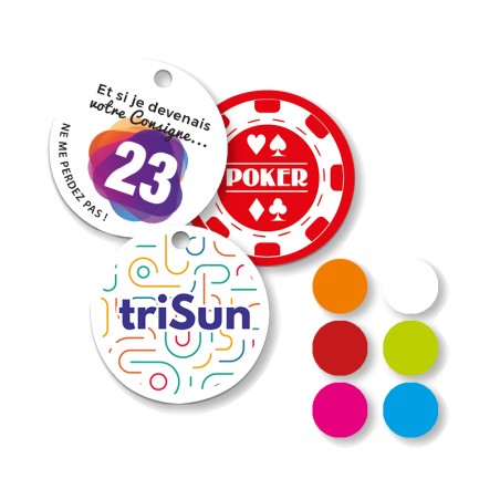 Jeton. Dimensions d'une pièce de 2 Euros. Ø 26 mm, épaisseur 2,3 mm. Marquage 1 couleur ou Quadri-Numérique avec ou sans trou. Jeton à trou pour coloris blanc uniquement. Quadri-Numérique avec ou sans trou, avec position du trou aléatoire ; pour un marquage placé par rapport au trou, nous consulter. Pour un marquage 2ème face en 1 couleur, nous consulter.
