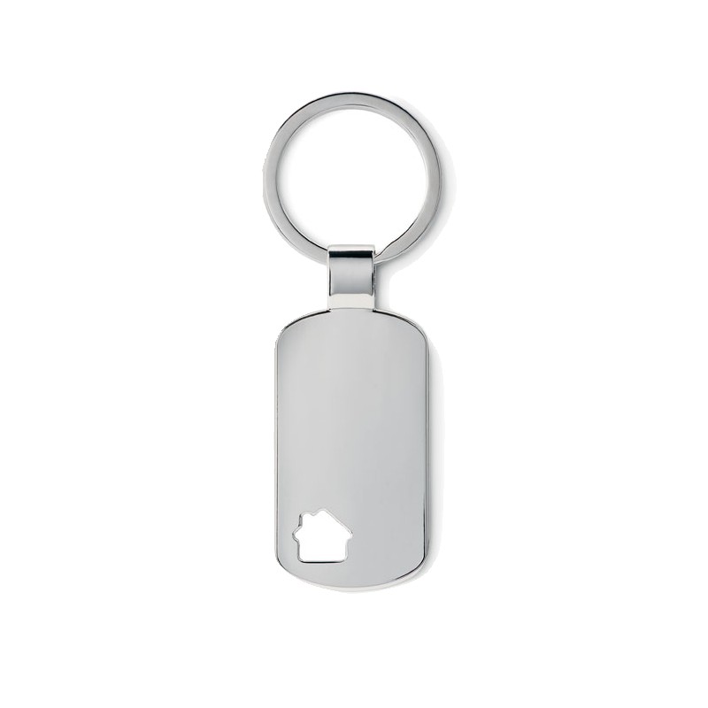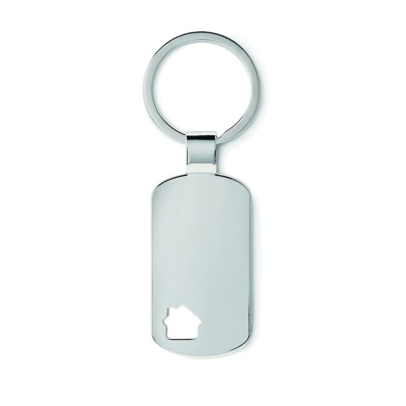 Porte-clés en métal avec détail maison dans un coin. Présenté dans une boîte.