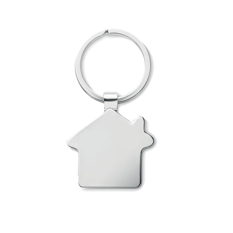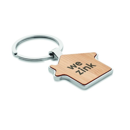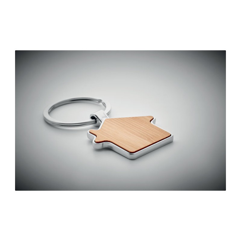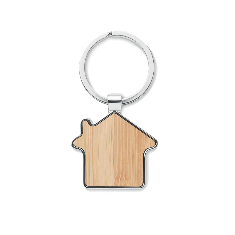 Porte-clés en alliage de zinc en forme de maison avec surface en bambou. Le bambou est un produit naturel, il peut y avoir de légères variations de couleur et de taille par article.