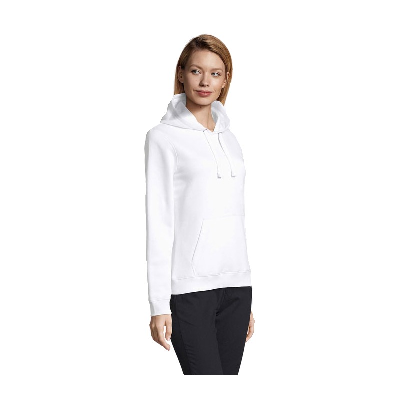 SOL'S SPENCER WOMEN, SWEAT-SHIRT FEMME À CAPUCHE, 80% coton Ringspun - 20% polyester, Intérieur gratté, Extérieur 100% coton Molleton 280 technologie LSF (low shrinkage fabric), Poche kangourou, Coupé cousu, Capuche doublée avec cordon de serrage, Poignets et bas en bord côte 2x2, Demi-lune à l'intérieur du col, Bande de propreté intérieur col, (1) Anthracite chiné : 60 % coton / 40 % polyester, (2) Gris chiné : 75 % coton / 20 % polyester / 5 % viscose, (3) Blanc chiné : 79 % coton / 20 % polyester / 1 % viscose, (4) Oxblood chiné : 60 % coton / 40 % polyester, (5) Denim chiné : 60 % coton / 40 % polyester.Pour la correspondance des tailles, veuillez vous référer au size chart dans la documentation produit.