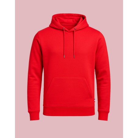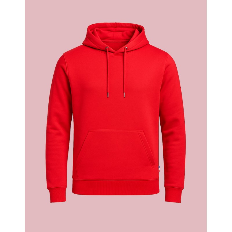 Sweat-Shirt Capuche Hoodie unisexe Made in France 80% coton biologique certifié OCS 20% polyester recyclé. Matière Terry 350g/m² lavée, non grattée pour éviter le boulochage + traitement silicone pour améliorer la longévité du vêtement. Capuche doublée dans la matière. Cordon ton sur ton avec embout métal. Col en demi lune dans la matière extérieure. Poche ventrale kangourou. Bande de propreté au col. Double piqure en bas de corps et de manches. Toucher soyeux
