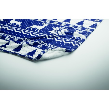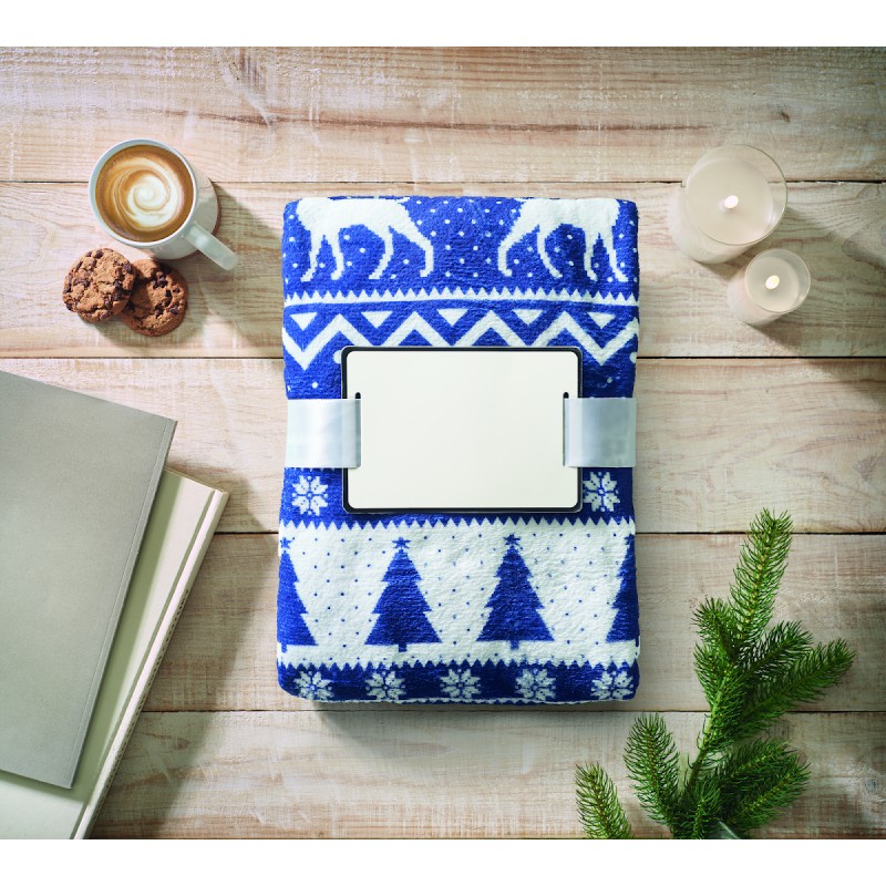 Couverture en polaire corail RPET 190 gr/m² avec motif hivernal. Enveloppée d'un ruban et d'une carte imprimable.
