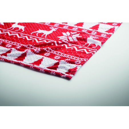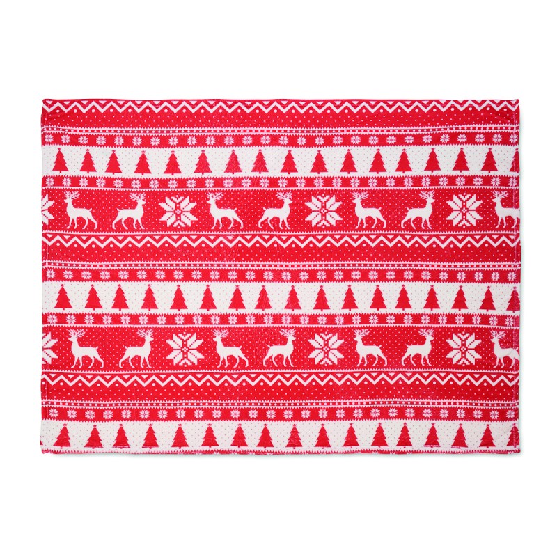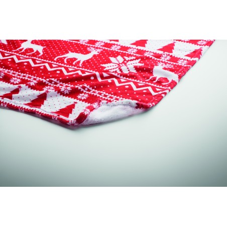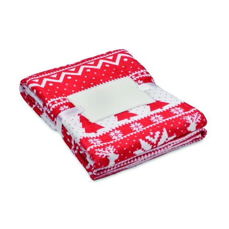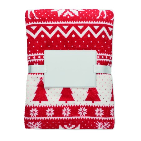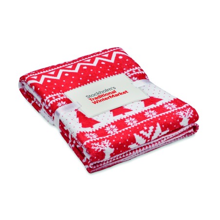 Couverture en polaire corail RPET 190 gr/m² avec motif hivernal. Enveloppée d'un ruban et d'une carte imprimable.